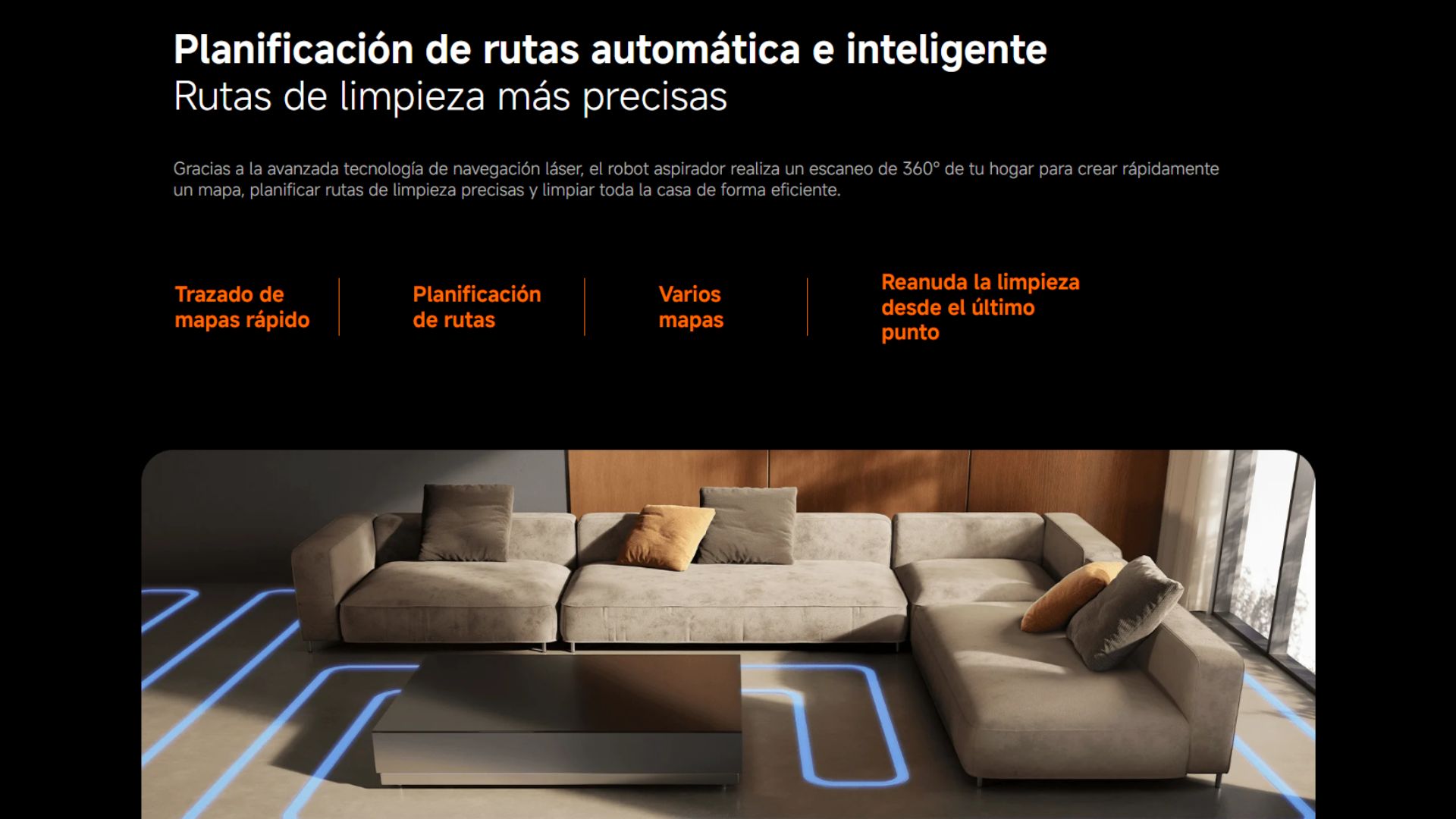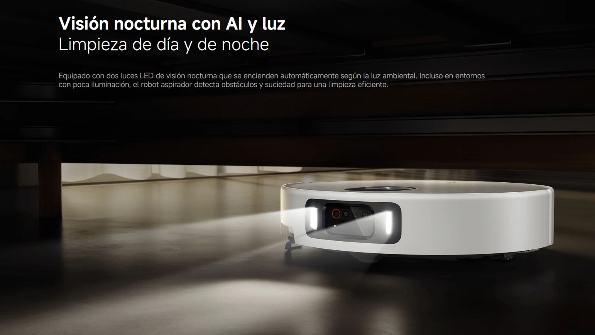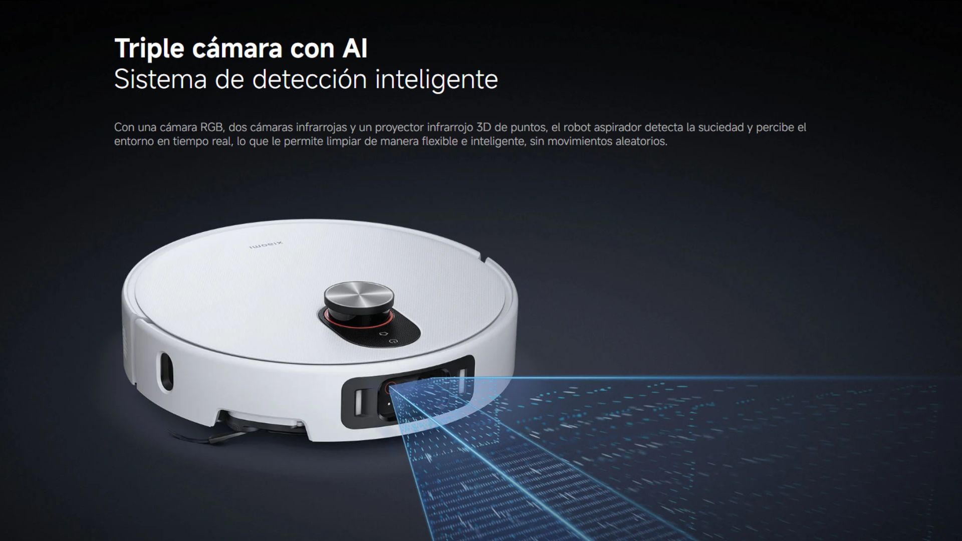 Con una cámara RGB, dos cámaras infrarrojas y un proyector infrarrojo 3D de puntos, el robot aspirador detecta la suciedad y percibe el entorno en tiempo real, lo que le permite limpiar de manera flexible e inteligente, sin movimientos aleatorios.