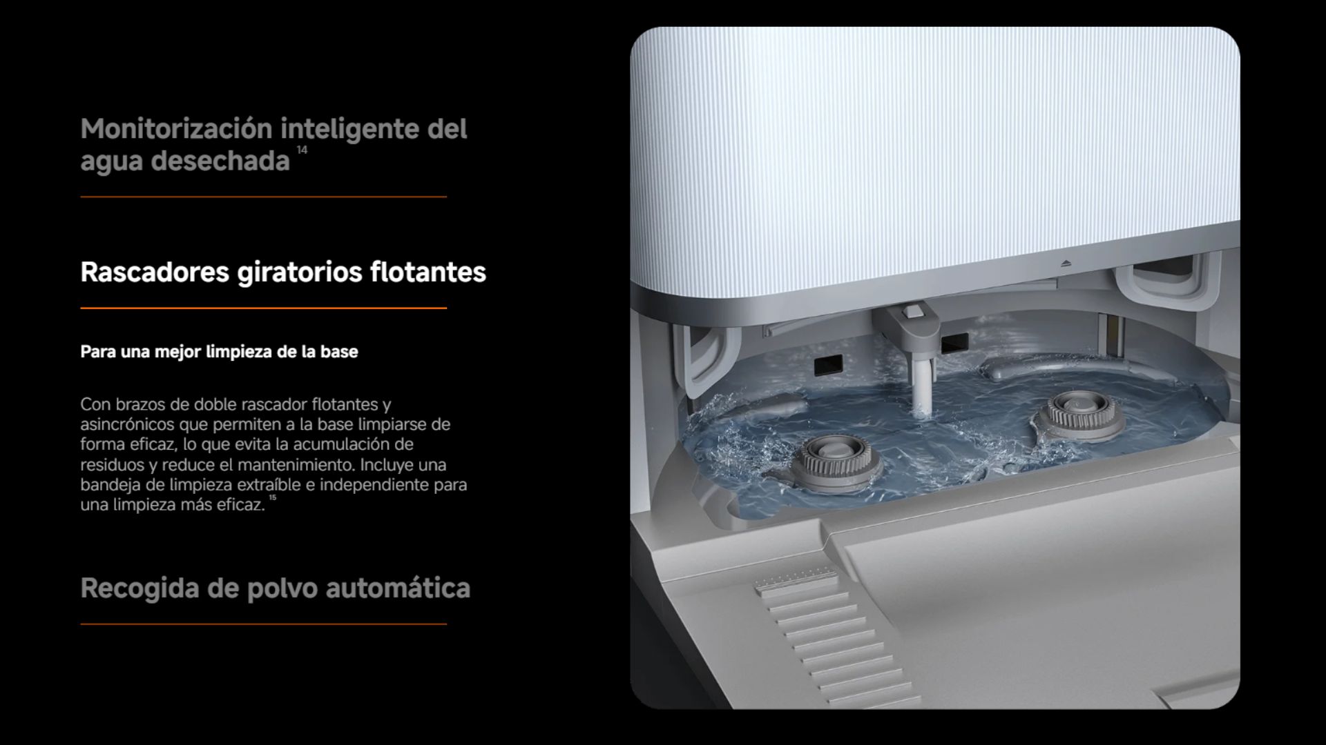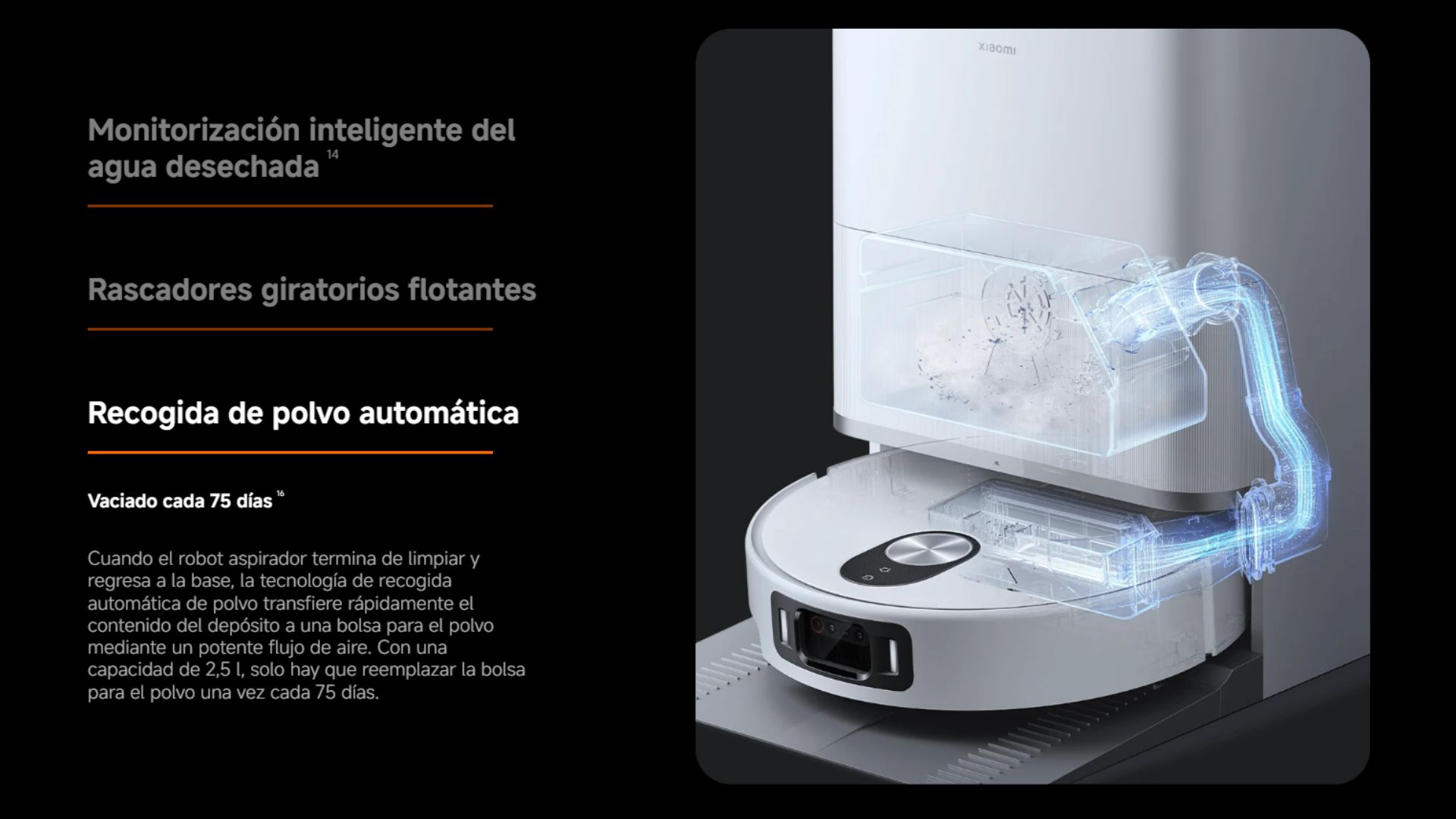| Contenido del Paquete | 1x robot aspirador | 1x estación Omni (con bolsa desechable, depósito de agua limpia, depósito de agua sucia y tabla de lavado) | 1x compartimento de polvo | 1x filtro (preinstalado en el compartimento de polvo) | 1x cepillo lateral | 1x cepillo principal antienredos | 1x cubierta del cepillo | 1x juego de cables | 1 extensor de base tipo tabla de lavar | 2x soportes para almohadilla de la mopa (con 2 almohadillas de la mopa preinstaladas) | 1x manual de usuario | 1x guía de imágenes | 1x guía de inicio rápido | 1x aviso de garantía |
