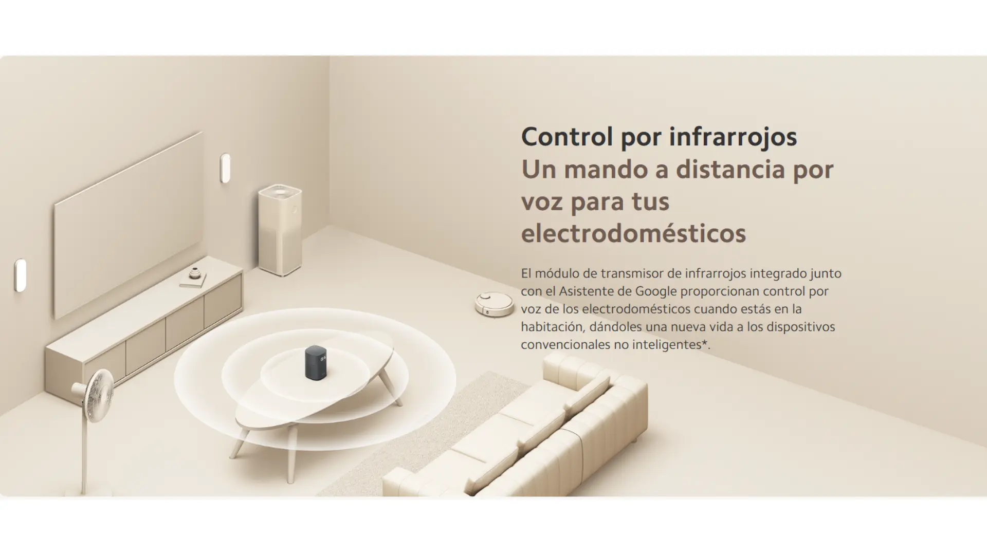 | Mando a distancia por infrarrojos | La función de control por infrarrojos del Xiaomi Smart Speaker (IR Control) solo la admiten dispositivos compatibles. Probado con los modelos: ventiladores: CHANGHONG CFS-LD402RF, Midea FS40-13GR; proyectores: Epson EMP-1710, HITACHI HCP-810X; aires acondicionados: MIJIA KFR-50GW/N1A1; pantallas de TV: Mi LED TV 4S 65’’, Mi TV P1 50’’; LED: Panasonic HHXZ4034. |
