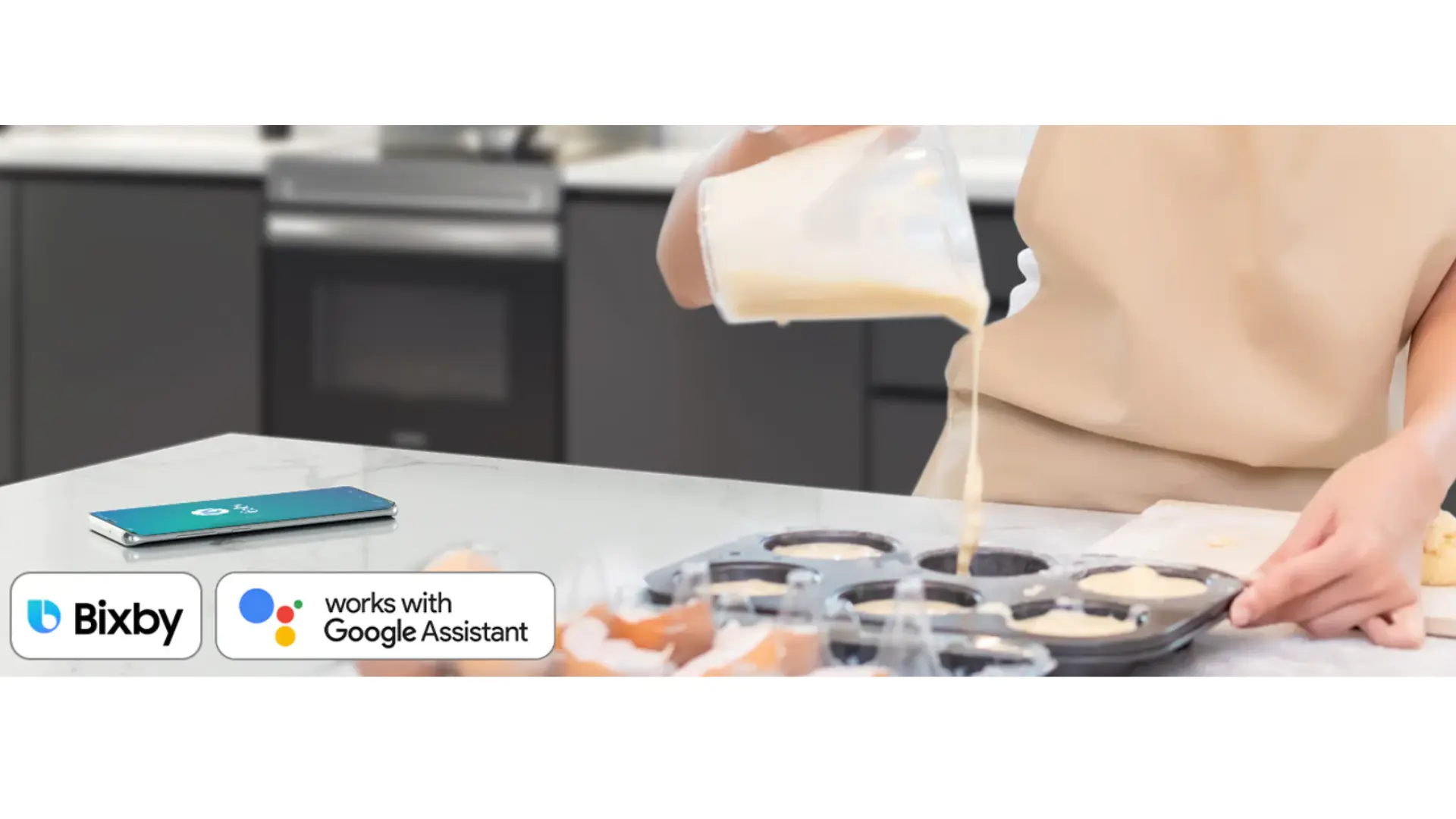 Logra que tu experiencia culinaria sea más simple y alegre. El horno cuenta con wifi para que puedas controlar sus funciones con facilidad mediante un asistente de voz*, como Samsung Bixby**. Además, SmartThings Cooking*** ofrece recetas****, planes de comidas, una experiencia culinaria guiada***** y compras sin esfuerzo
