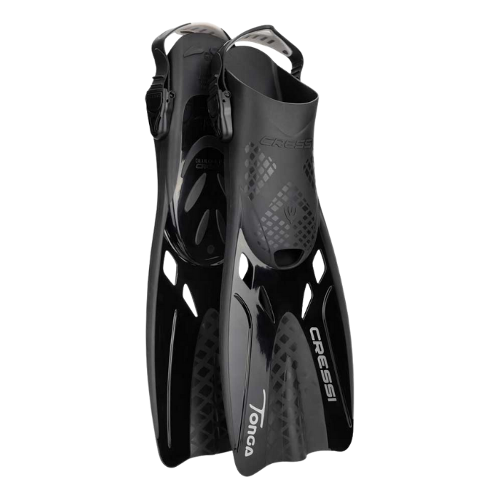 Las patas de rana Tonga de Cressi son aletas cortas de talón abierto con correas ajustables que se pueden usar para natación o buceo. Son ideales para viajeros gracias a su tamaño y poco peso. Las hebillas tienen un diseño especial para garantizar su resistencia bajo un uso prolongado. La correa de la aleta cuenta con lazo grande para el pulgar y facilitar así la colocación y el desmontaje. También es práctico para colgar en un gancho luego de lavar las patas.