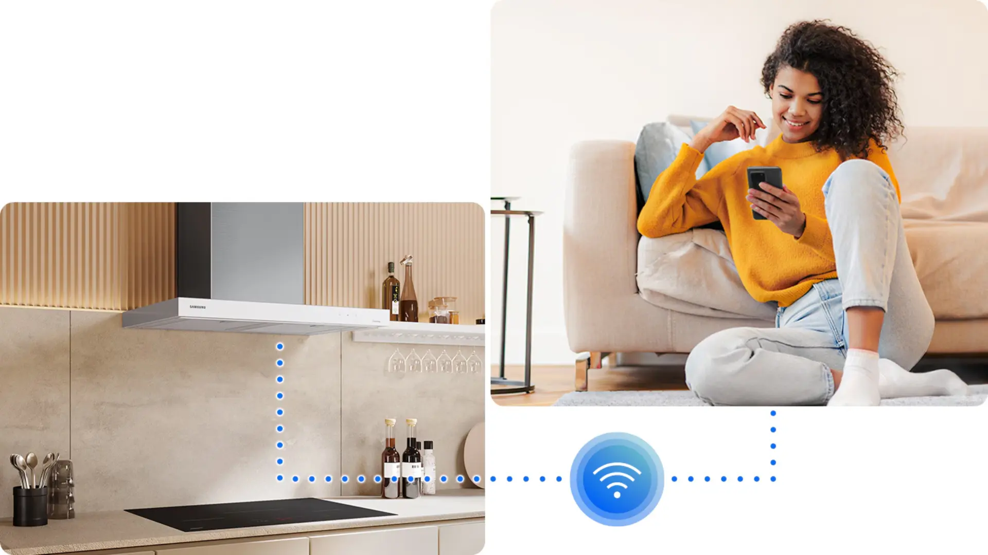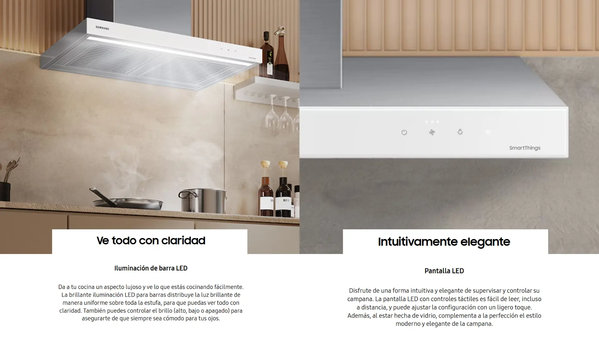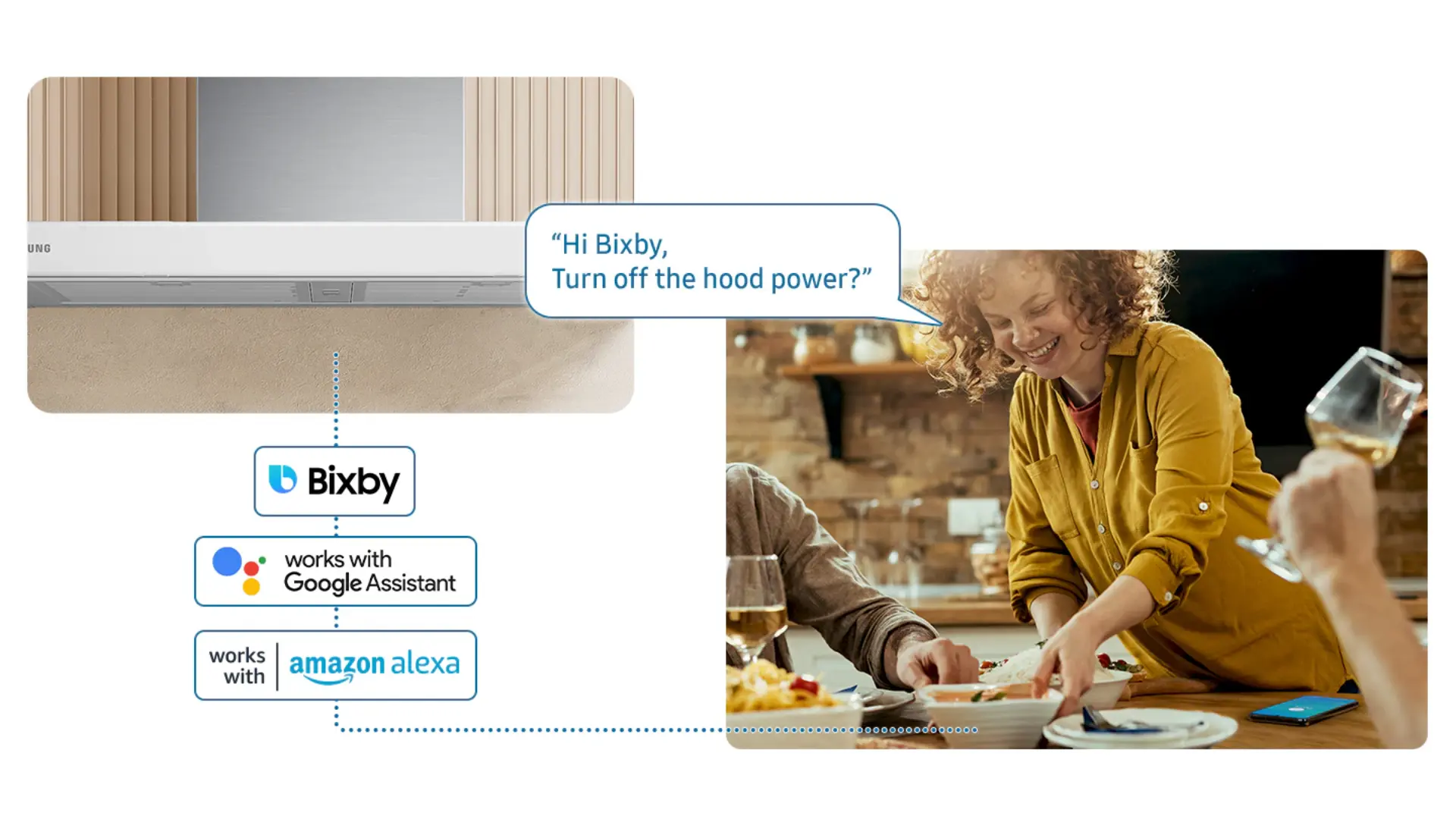 Controle la campana de la cocina con tu voz. Usando un asistente de voz*, como Samsung Bixby, Amazon Alexa o Google Assistant, simplemente di lo que quieres que haga la campana de la cocina y lo hará. Puedes encenderla/apagarla, así como la luz y el ventilador, activar temporizadores y cambiar configuraciones, como la velocidad del ventilador.