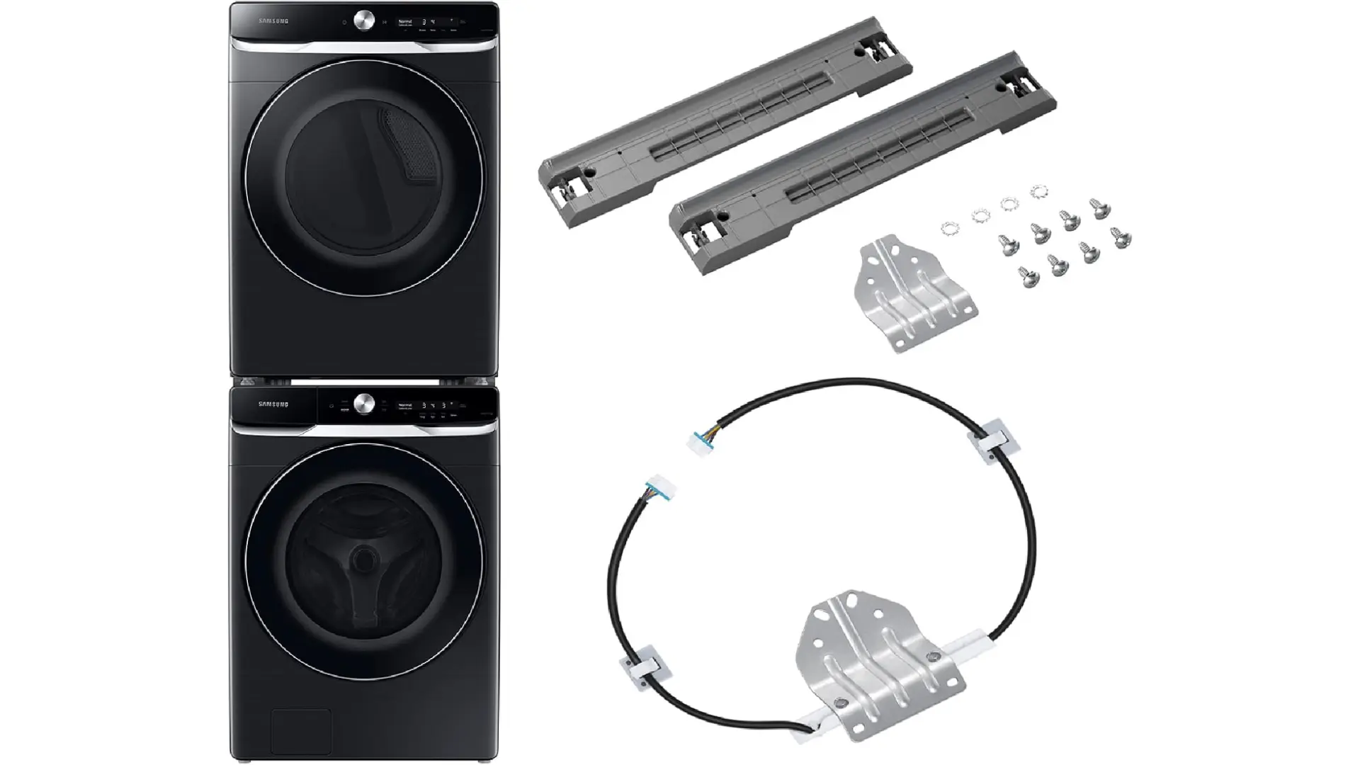 El kit de apilamiento de lavandería SAMSUNG es compatible con la mayoría de lavadoras y secadoras de carga frontal SAMSUNG de 27 pulgadas de ancho; utiliza el kit de apilamiento para sujetar y organizar tus unidades con la secadora en la parte superior de la lavadora para utilizar mejor el espacio de lavandería