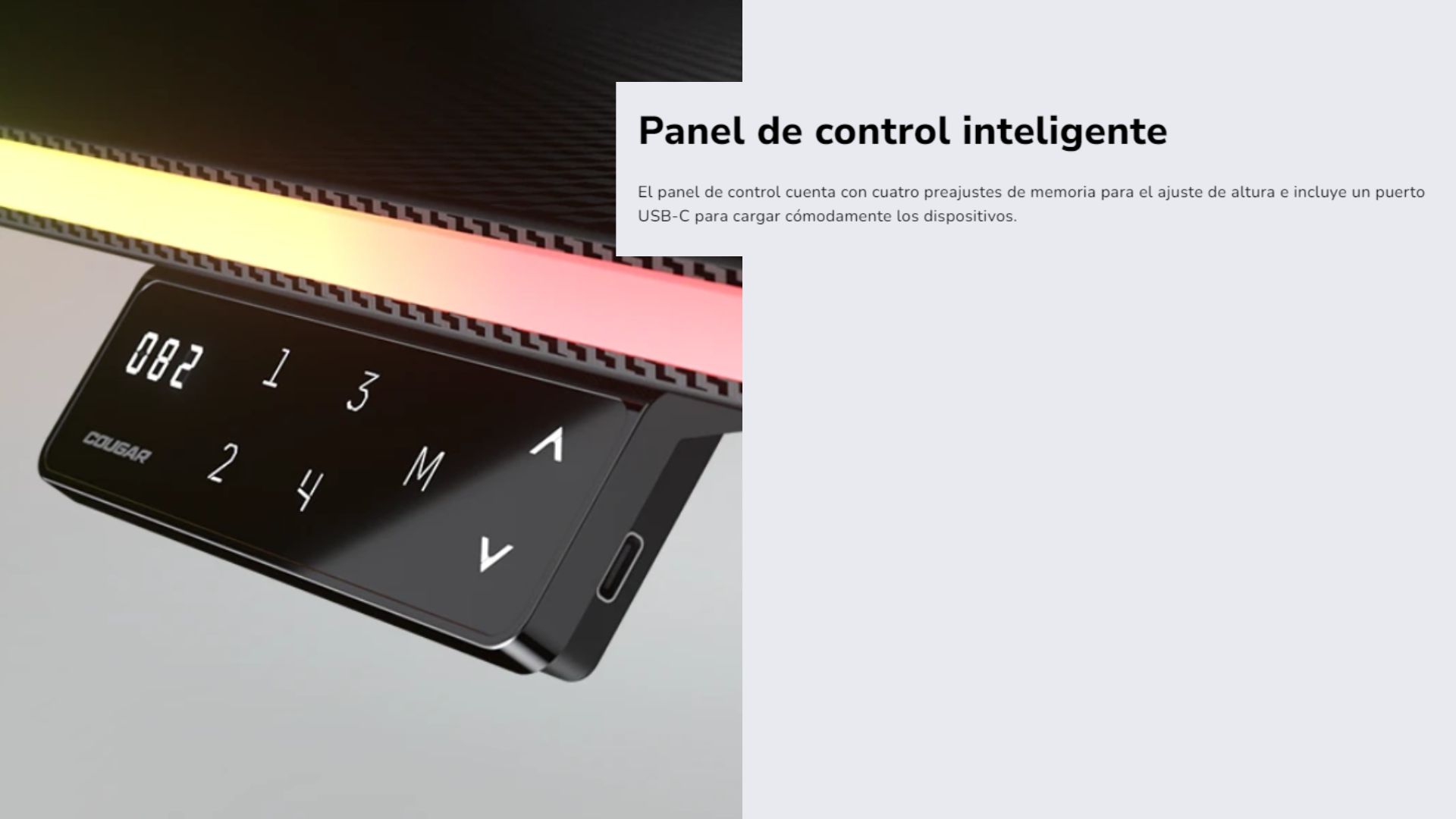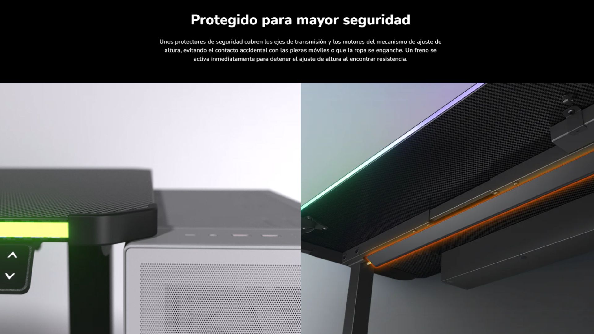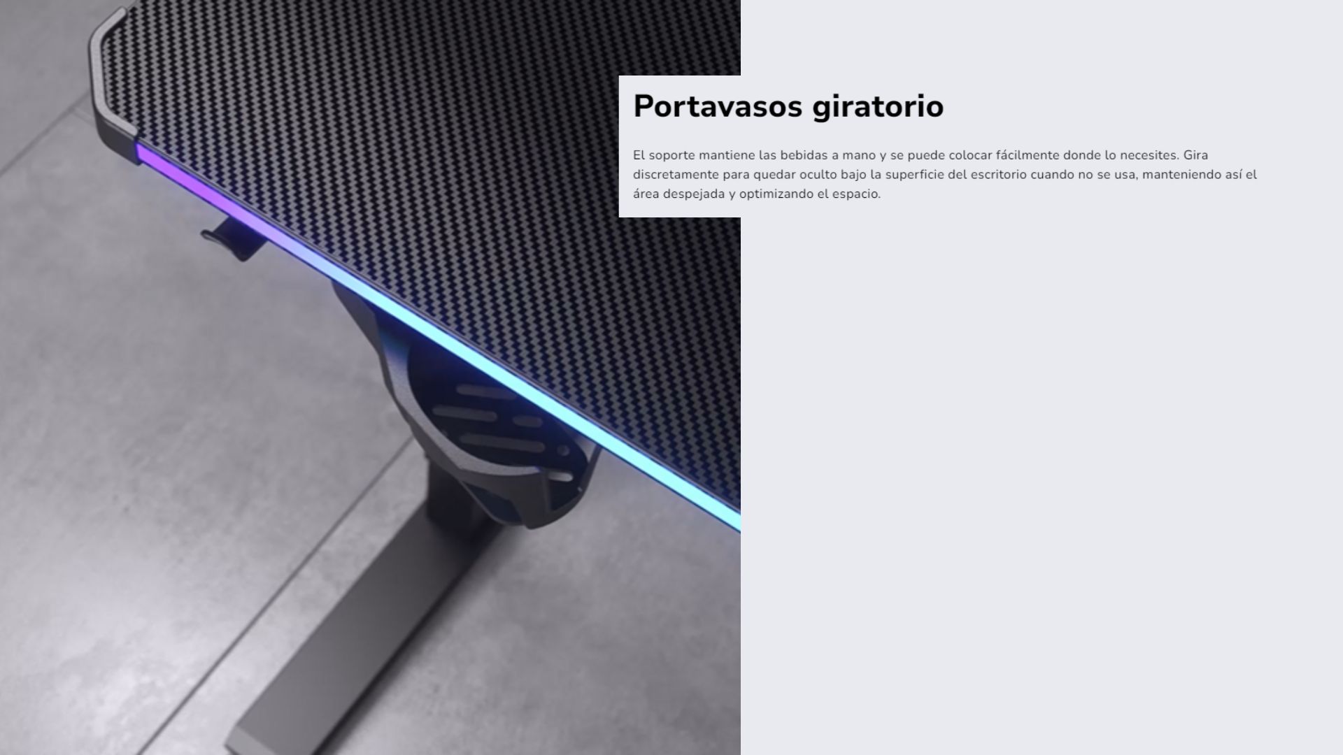 El escritorio eléctrico para juegos E-Ares 120 ofrece una funcionalidad compacta y duradera con iluminación RGB en un formato reducido de 120 × 60 mm, integrando un ajuste de altura seguro con características que mejoran la experiencia de usuario, como un portavasos giratorio y un puerto de carga USB-C.