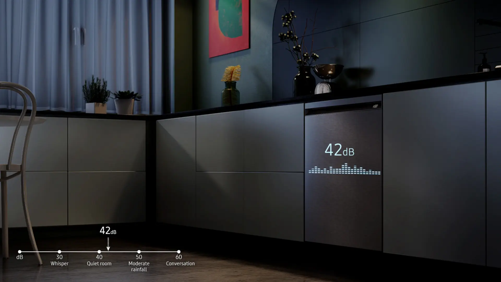 Evita los ruidos molestos en casa con un lavavajillas ultrasilencioso. Su motor BLDC sin fricción reduce significativamente el ruido y el tambor de acero inoxidable absorbe gran parte del sonido y las vibraciones. Posee solo 42 decibelios* por lo que es casi tan silencioso como si estuvieras en una biblioteca y no perturbará tu vida cotidiana