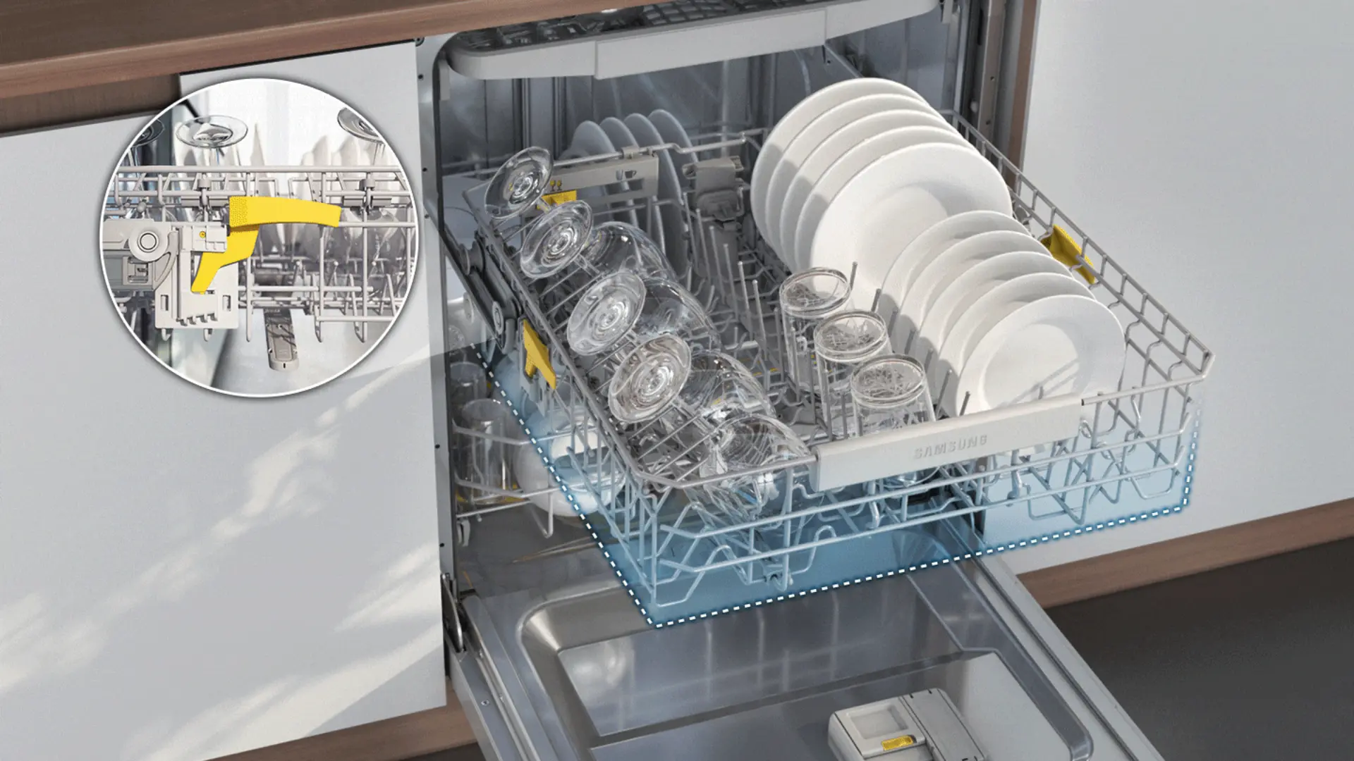 Ajusta la altura del estante central y sus púas con un solo toque, mediante las palancas, para que se adapte fácilmente a varias formas y tamaños de platos. Las púas de la rejilla inferior también se pliegan para que quepan en utensilios de cocina grandes. Además, la canasta de cubiertos ampliada* se puede mover fácilmente para usar la rejilla inferior como te resulte más cómodo.