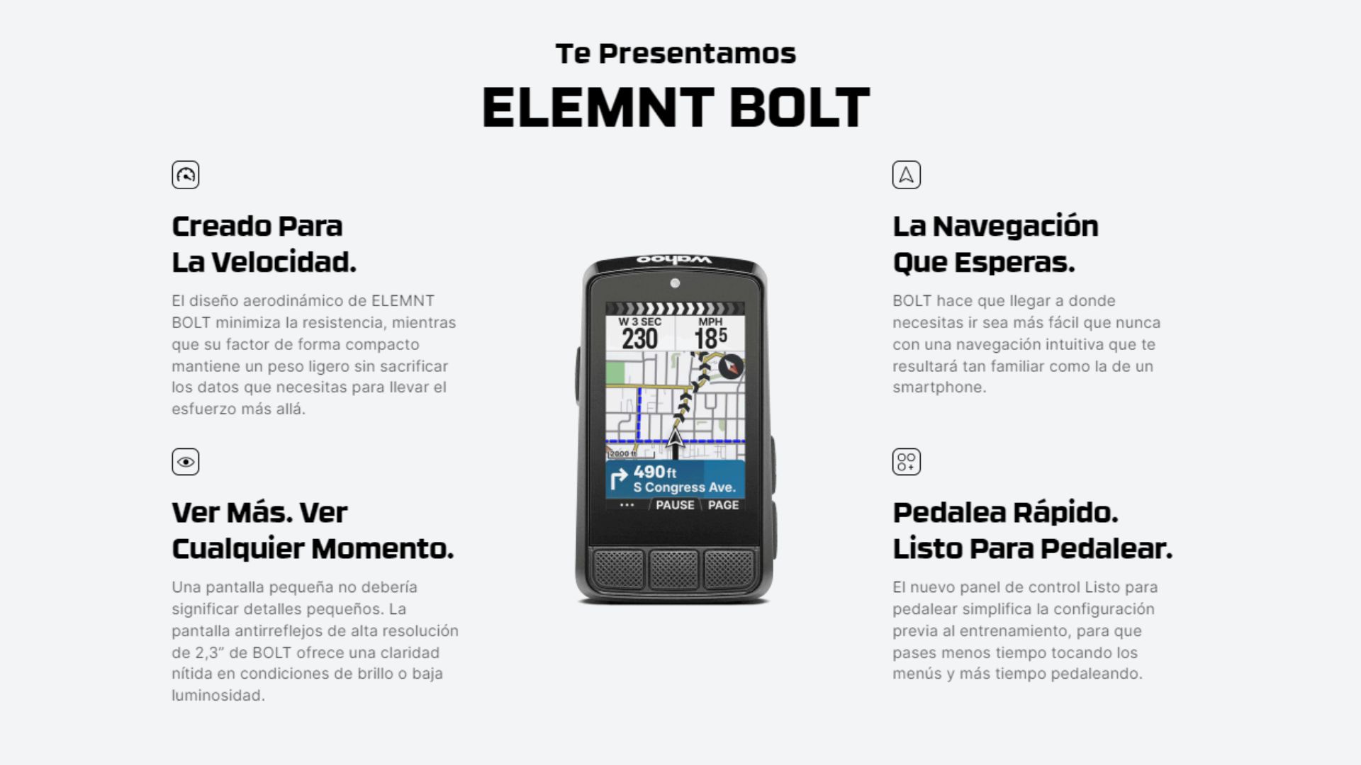 El totalmente nuevo ELEMNT BOLT combina un diseño listo para la competición con una pantalla más grande y de alto contraste de 2,3” para una lectura nítida a cualquier velocidad y en cualquier condición.