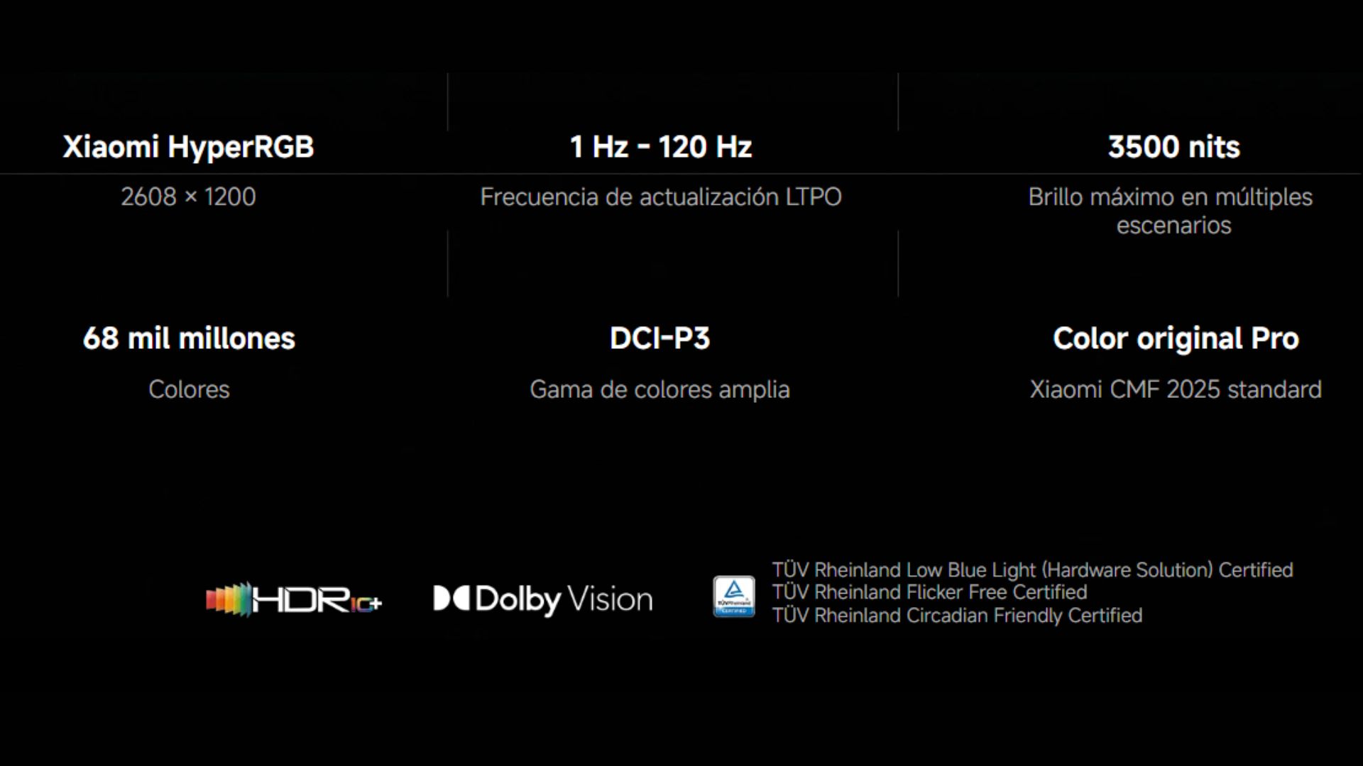 | Pantalla | 6,9 Xiaomi HyperRGB pantalla OLED (174,5 mm) | Xiaomi Shield Glass 3.0 | Resolución: 2608 x 1200 Xiaomi HyperRGB | Frecuencia de actualización: 1 - 120 Hz | Frecuencia de muestreo táctil: hasta 300 Hz | Gama de colores: DCI-P3 | Profundidad de color: 12 bit | Brillo: 3500 nits de brillo máximo en múltiples escenarios | Atenuación DC de cuidado ocular | Color original PRO | Pro HDR | tecnología de toque húmedo | HDR10+, Dolby Vision® | Certificación TÜV Rheinland Low Blue Light (Hardware Solution) | Certificación TÜV Rheinland Flicker Free | Certificación TÜV Rheinland Circadian Friendly |
