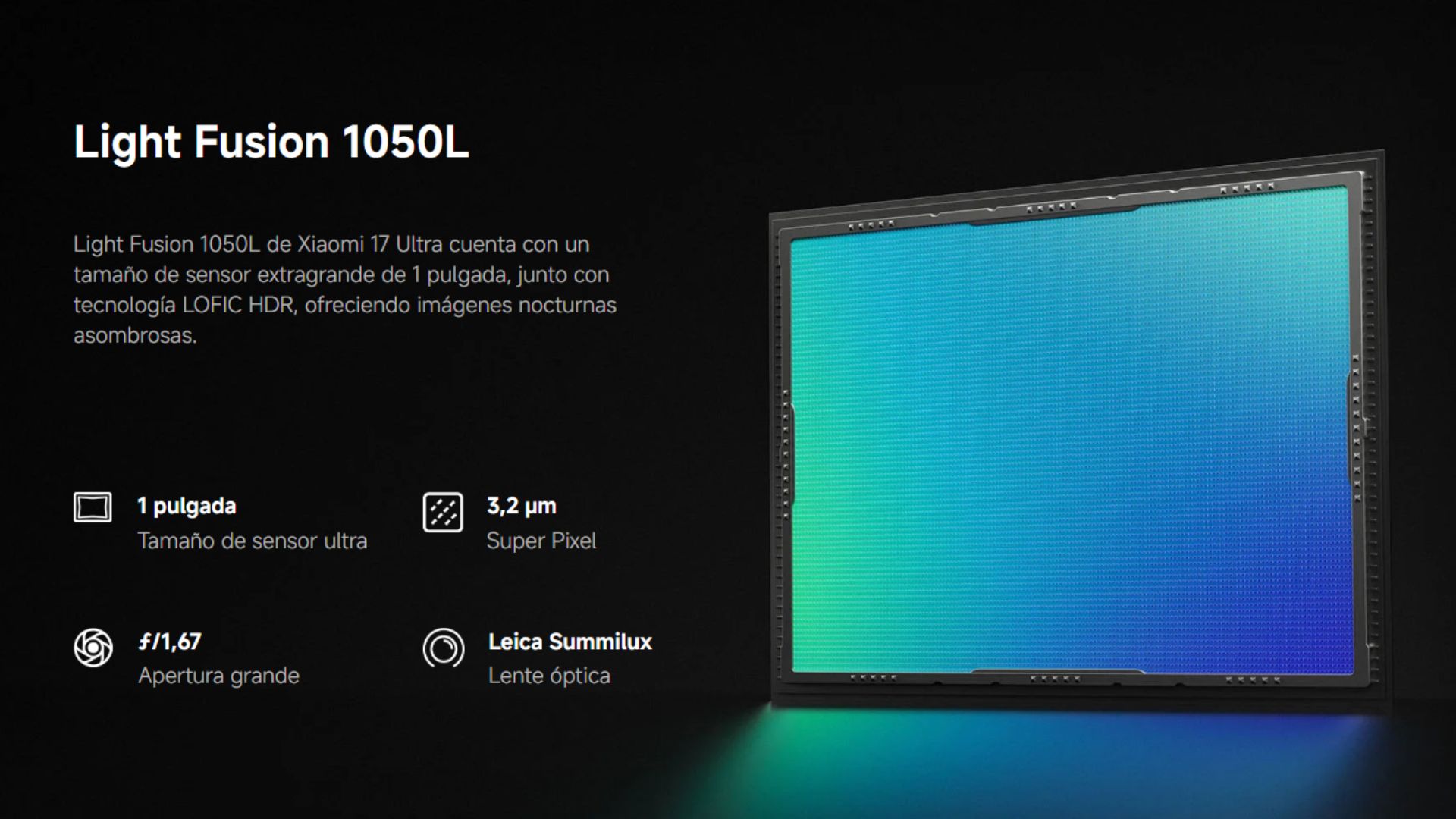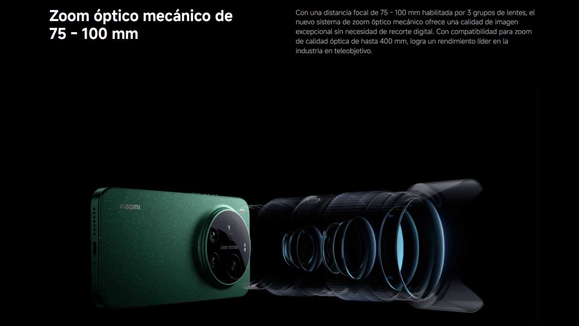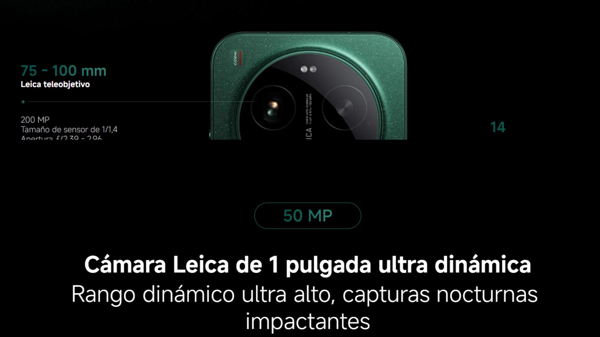 | Cámara Trasera | Leica Summilux lente óptico VARIO-APO-SUMMILUX 1:1.67-2.9/14-100 ASPH - Leica 23 mm cámara principal | 50 MP | Light Fusion 1050L sensor de imagen | Tamaño de sensor de 1 pulgada | 3,2 μm Super Pixel 4 en 1 | f/1,67 | OIS | 23 mm longitud focal equivalente - Leica 200 MP 75-100 mm telefoto | 200 MP | Samsung HPE sensor de imagen | Tamaño de sensor de 1/1,4 | 2,24 μm tamaño de píxel 16 en 1 | f/2,39-f/2,96 | OIS | 75-100 mm longitud focal equivalente - Leica 14 mm cámara ultra gran angular | 50 MP | Samsung JN5 sensor de imagen | Tamaño de sensor de 1/2,75 | 1,28 μm tamaño de píxel 4 en 1 | f/2,2 | 14 mm longitud focal equivalente | Campo de visión 115° - Funciones de fotografía de la cámara trasera | Dos estilos fotográficos Leica (Leica Authentic Look, Leica Vibrant Look)filtros Leica | sonido de obturador clásico Leica | marca de agua Leica | Xiaomi ProFocus (enfoque de seguimiento de movimiento, enfoque de seguimiento ocular y captura de movimiento) | Lightning Burst | Zoom digital de hasta 120x | Xiaomi ProCut | HDR | Toma dinámica | 50 MP (Gran angular/Ultra gran angular/Telefoto) | Modo 200 MP (Telefoto) | Live Cinematography | Super Macro | Supermoon (Auto) | Fastshot | Long Exposure | Panorama | Modo retrato | Modo documentos | Modo pro | Formatos de imagen capturados: JPG, HEIF | Modo RAW |