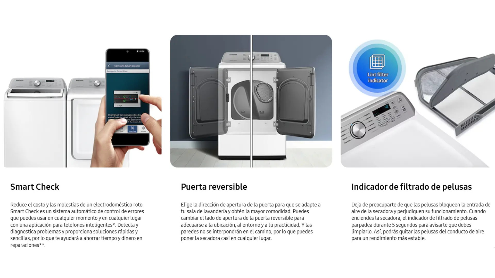 | Lista de Opciones | Bloqueo para niños (dos teclas), Smart Care (dos teclas), prevención de arrugas (pulsación larga) |