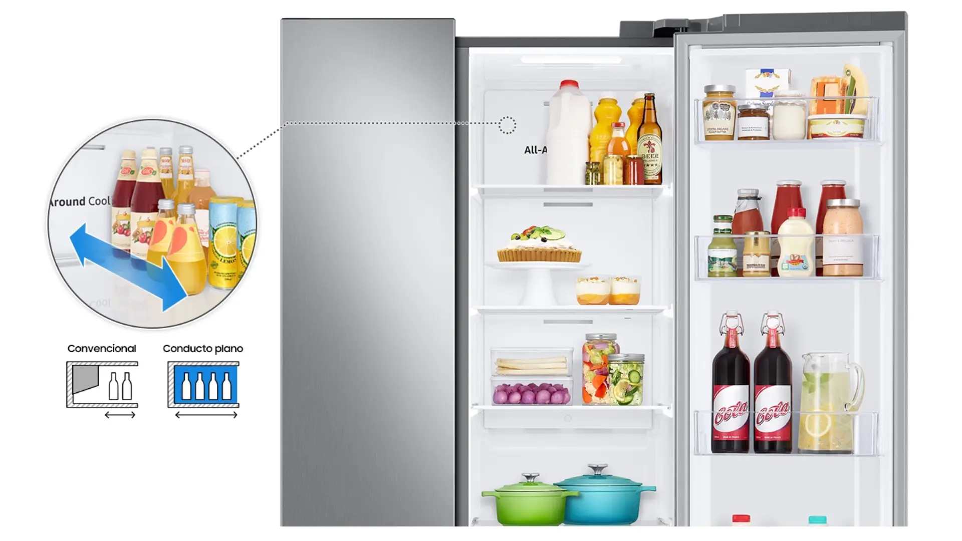 Obtén más espacio sin comprometer el rendimiento. A diferencia de los conductos convencionales, el sistema de ventilación de refrigeración en la pared trasera es completamente plano, lo que reduce el espacio muerto y genera más espacio para almacenar alimentos. Aún así, enfría y ventila con la misma eficacia, por lo que todo se mantiene fresco y sabroso.