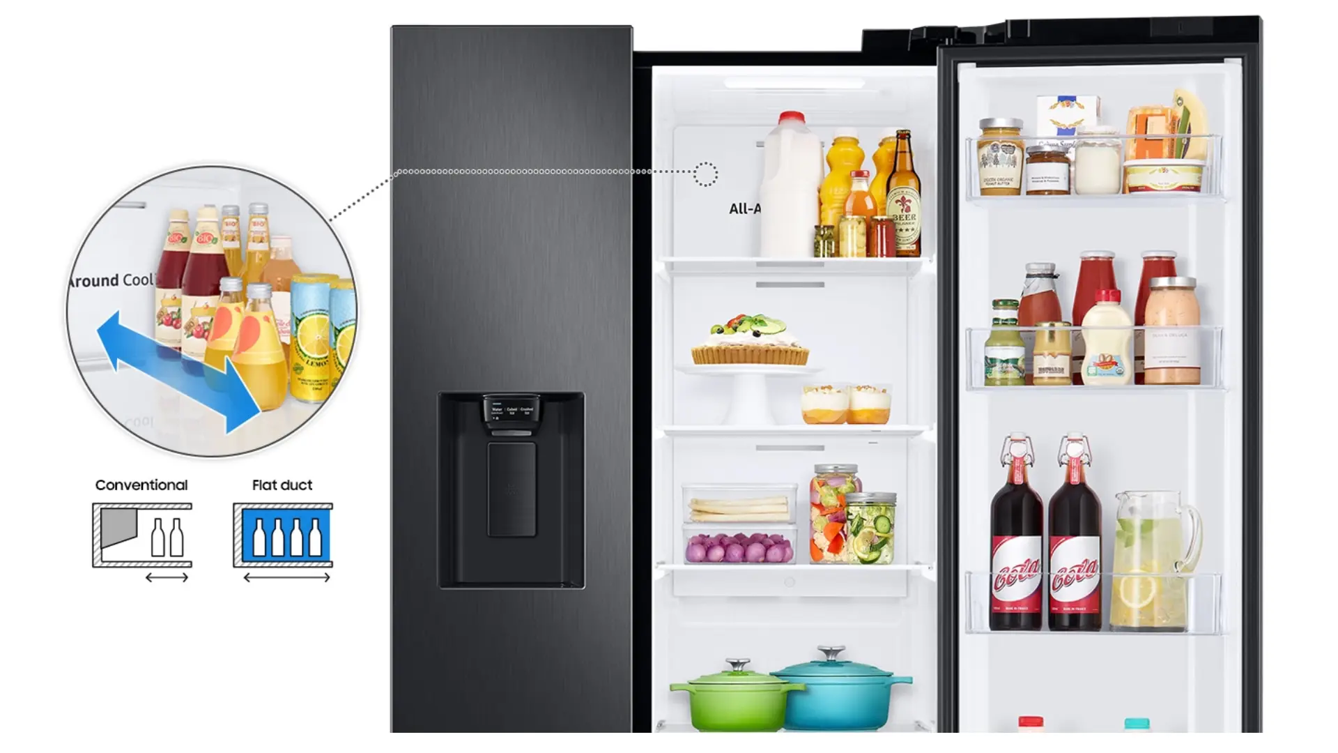 El sistema de ventilación de refrigeración en la pared trasera es completamente plano, lo que reduce el espacio muerto y genera más espacio para almacenar alimentos. Aún así, enfría y ventila con la misma eficacia, por lo que todo se mantiene fresco.