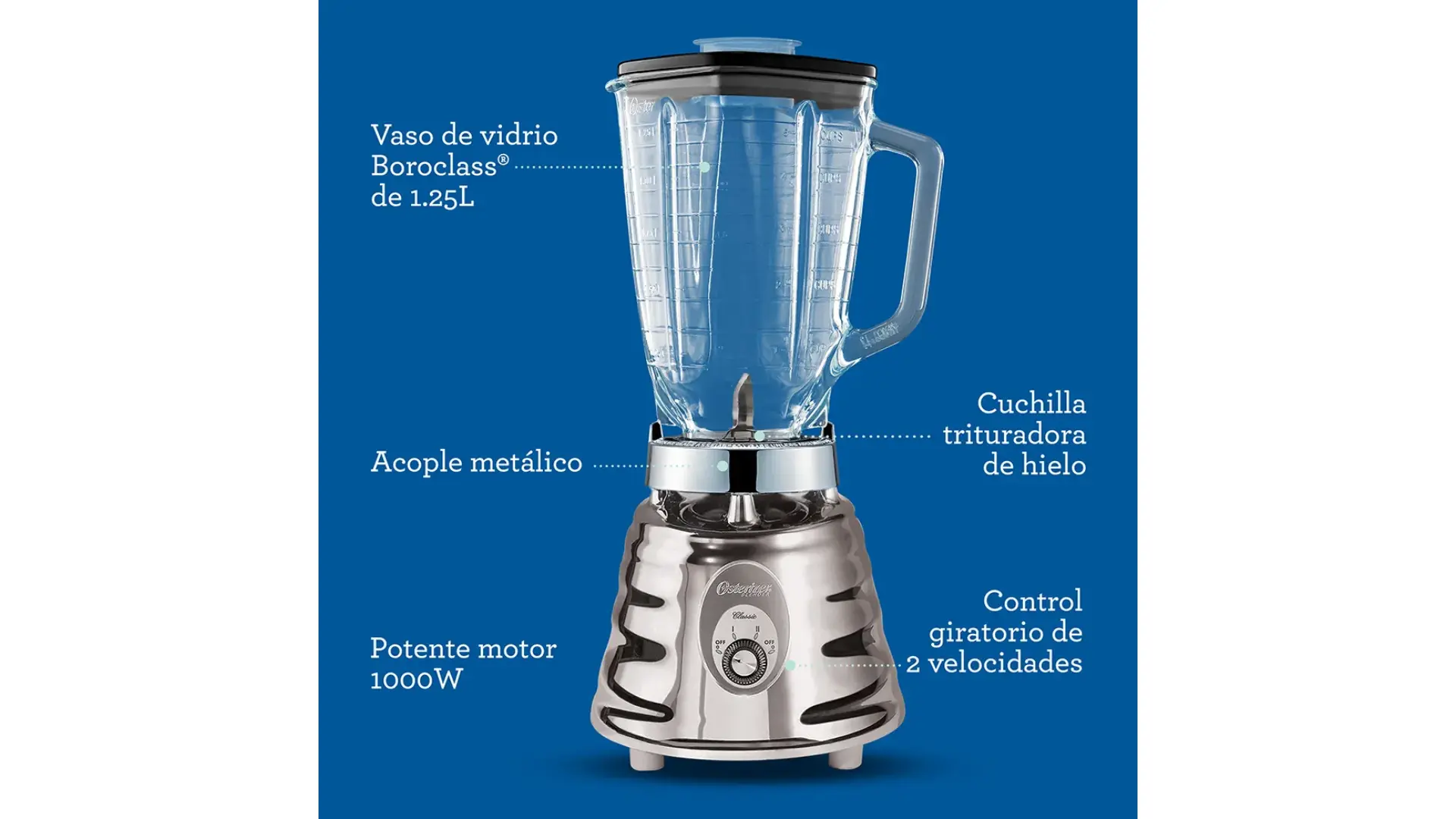 Nuestra licuadora clásica Oster® en cromo con control giratorio de 2 velocidades te brinda una experiencia inigualable. Su potente motor con 1000 W de potencia***, vaso de vidrio refractario Boroclass® resistente a ingredientes hirviendo*, acople metálico 10 veces más fuerte**, junto con su revolucionaria cuchilla trituradora de hielo te ayudan a preparar deliciosas y saludables recetas.