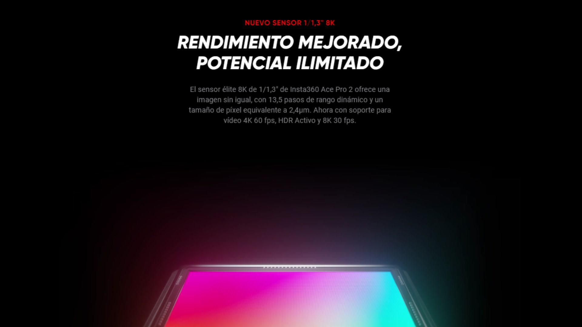 El sensor élite 8K de 1/1,3" de Insta360 Ace Pro 2 ofrece una imagen sin igual, con 13,5 pasos de rango dinámico y un tamaño de píxel equivalente a 2,4μm. Ahora con soporte para vídeo 4K 60 fps, HDR Activo y 8K 30 fps
