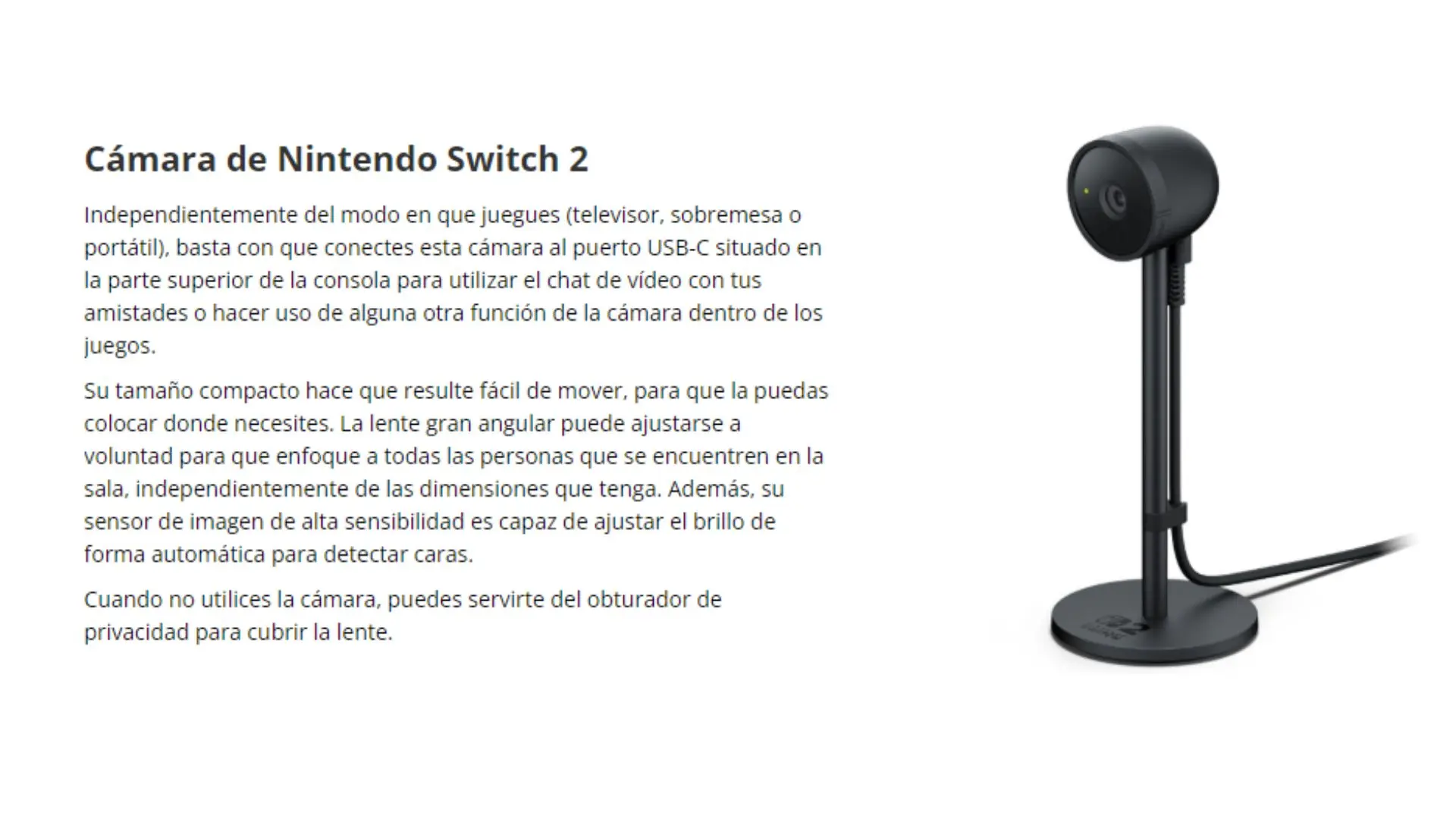 Conecta la cámara USB-C a la consola Nintendo Switch 2 para disfrutar de chats de vídeo con tus amigos o hacer que tu cara se muestre en el juego, por ejemplo.