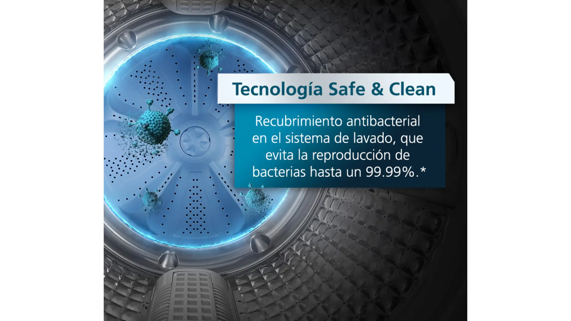 Tecnología Safe & Clean, recubrimiento antibacterial en propela, que evita la reproducción de baterias hasta un 99.99%. Maxima limpieza y cuidado de la ropa ahorrando energía, gracias al motor silencioso Direct Motion Motor. Sistema de lavado Power Wash, elimina los residuos de jabón con un lavado profundo y eficiente. Ciclo 4 Next day, eficiencia en el centrifugado.