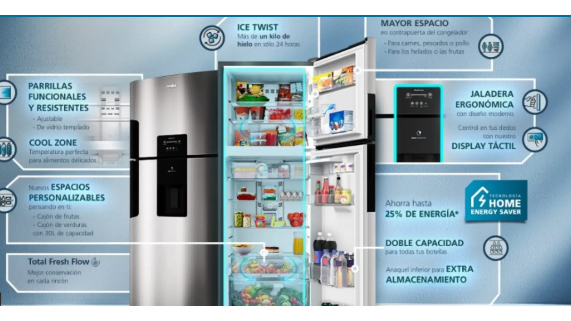 Amplio espacio interior que permite guardar alimentos y recipientes de gran tamaño. Anaquel de gran tamaño y profundidad para guardar botellas de refresco o botes de helado con facilidad. Ahorro de energía, mejor conservación y mayor frescura de los alimentos, gracias a su Tecnología Home Energy Saver.