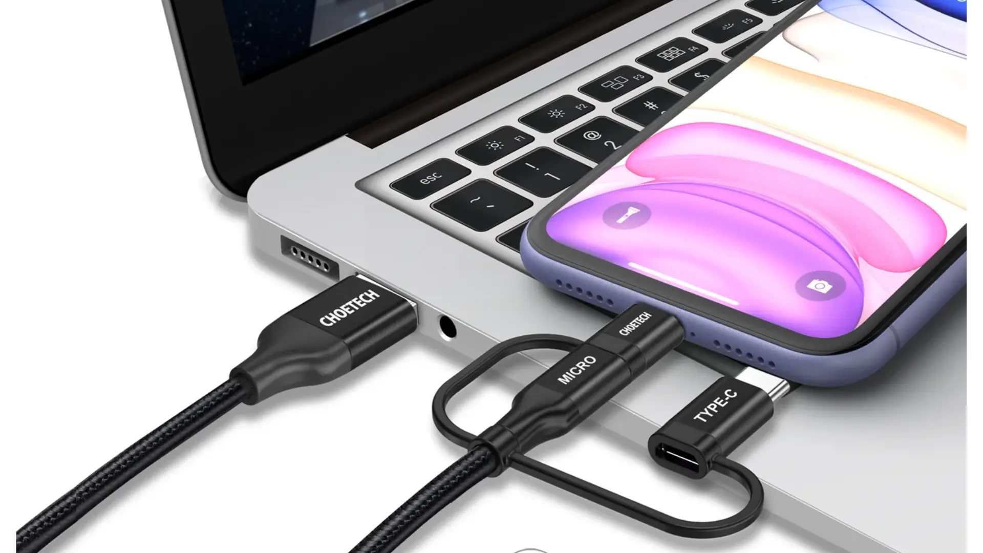 Cansado de llevar múltiples cables en tu mochila o tener un enredo en tu escritorio El Cable Choetech IP0030 es la solución definitiva "todo en uno". Con un diseño ingenioso de adaptadores integrados, este cable de 1.2 metros te permite cargar dispositivos con entrada Lightning (iPhone), USB-C y Micro-USB usando una sola fuente de energía