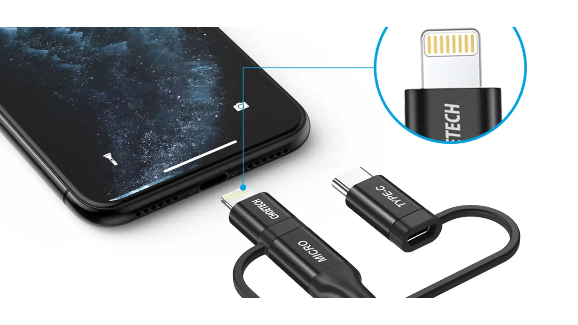 Cable de USB a Micro USB Choetech 3 en 1 con Adaptador de USB-C y Lightning 1.2mts IP0030
