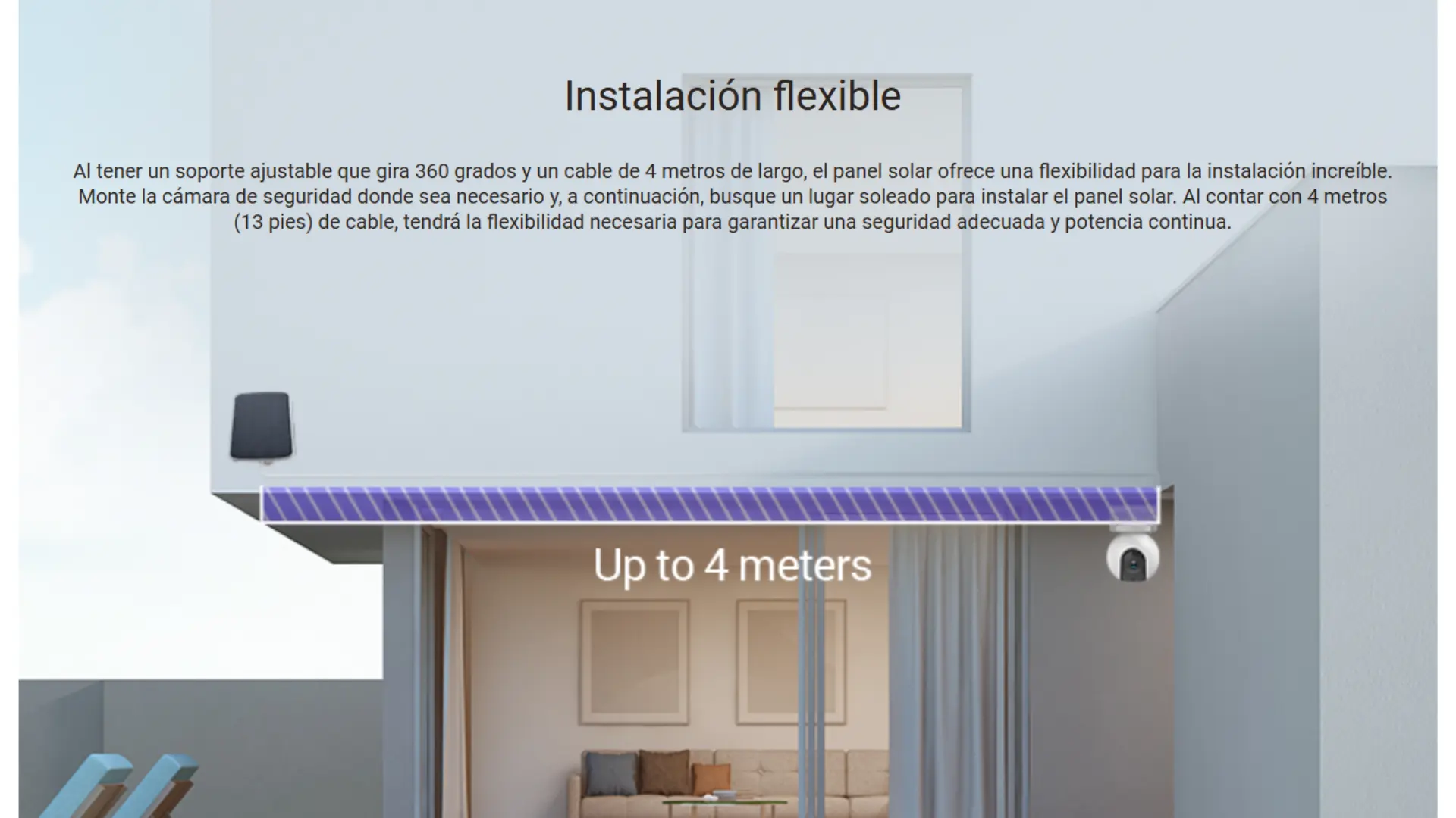 Fabricado con celdas solares de silicona cristalina, el panel solar produce hasta 6,18 W de potencia. Funciona a tope durante los días soleados para garantizar que la cámara a pilas tenga suficiente carga para operar todo el día y toda la noche.