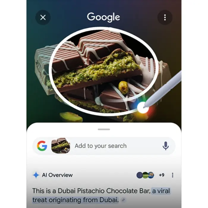 Busca con un círculo con Google te permite buscar al instante lo que quieras en tu pantalla. Rodea el objeto con el dedo o el S Pen —incluidas imágenes, videos o texto— y obtendrás resultados de Resumen de la AI de inmediato. Incluso puedes buscar una canción que escuches en el momento, sin cambiar de aplicación.