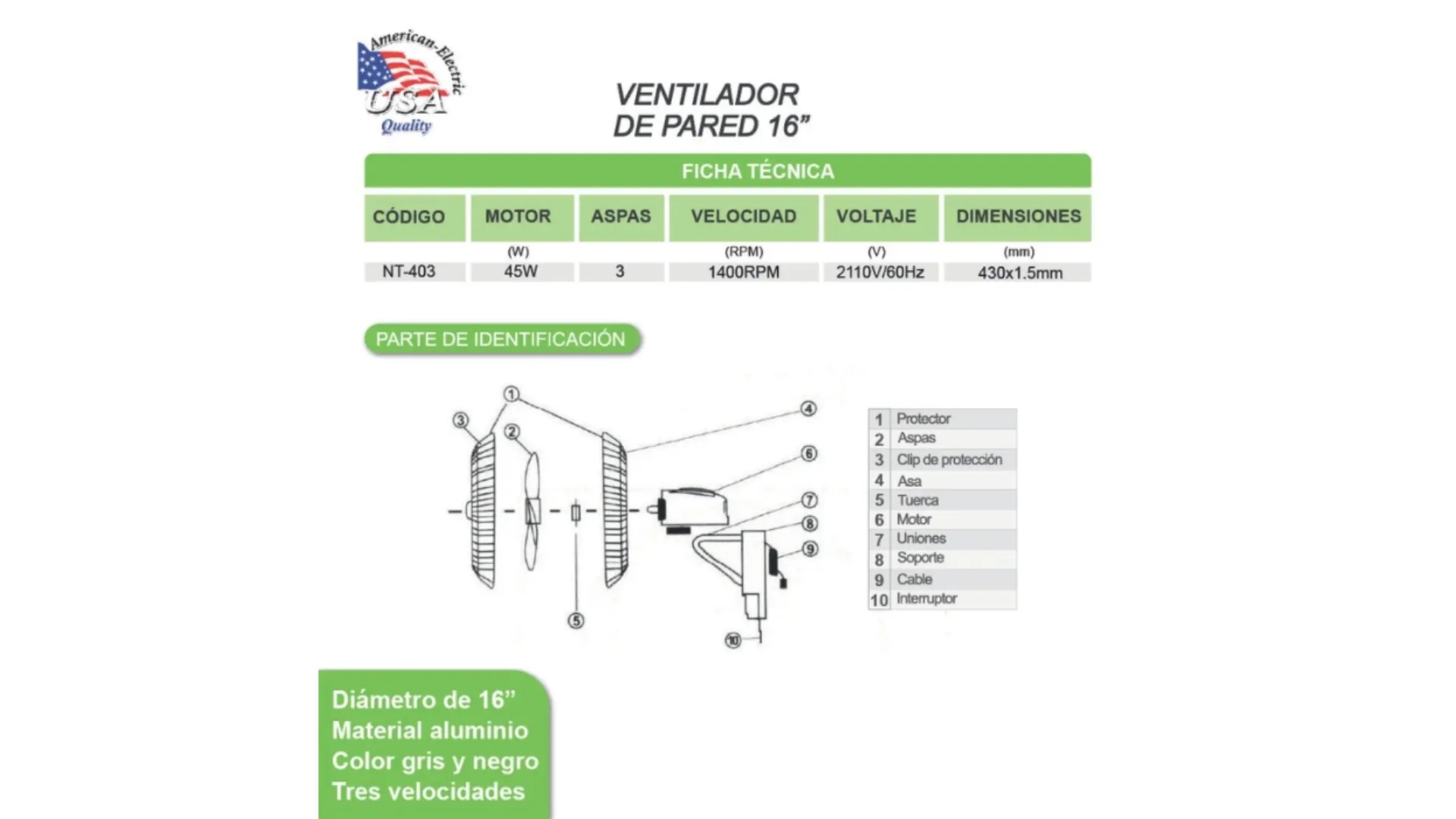 Ventilador de Pared American Electric 16″ 45W Gris/Negro NY-403