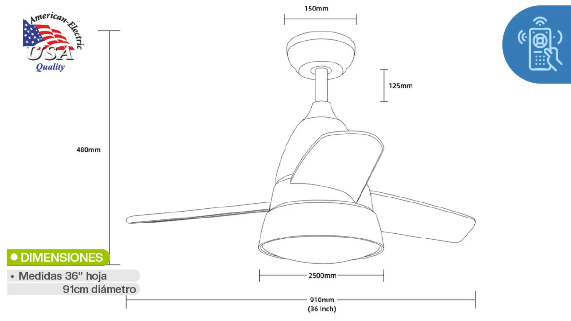 Motor AC de 70W | 3 velocidades | Con control remoto