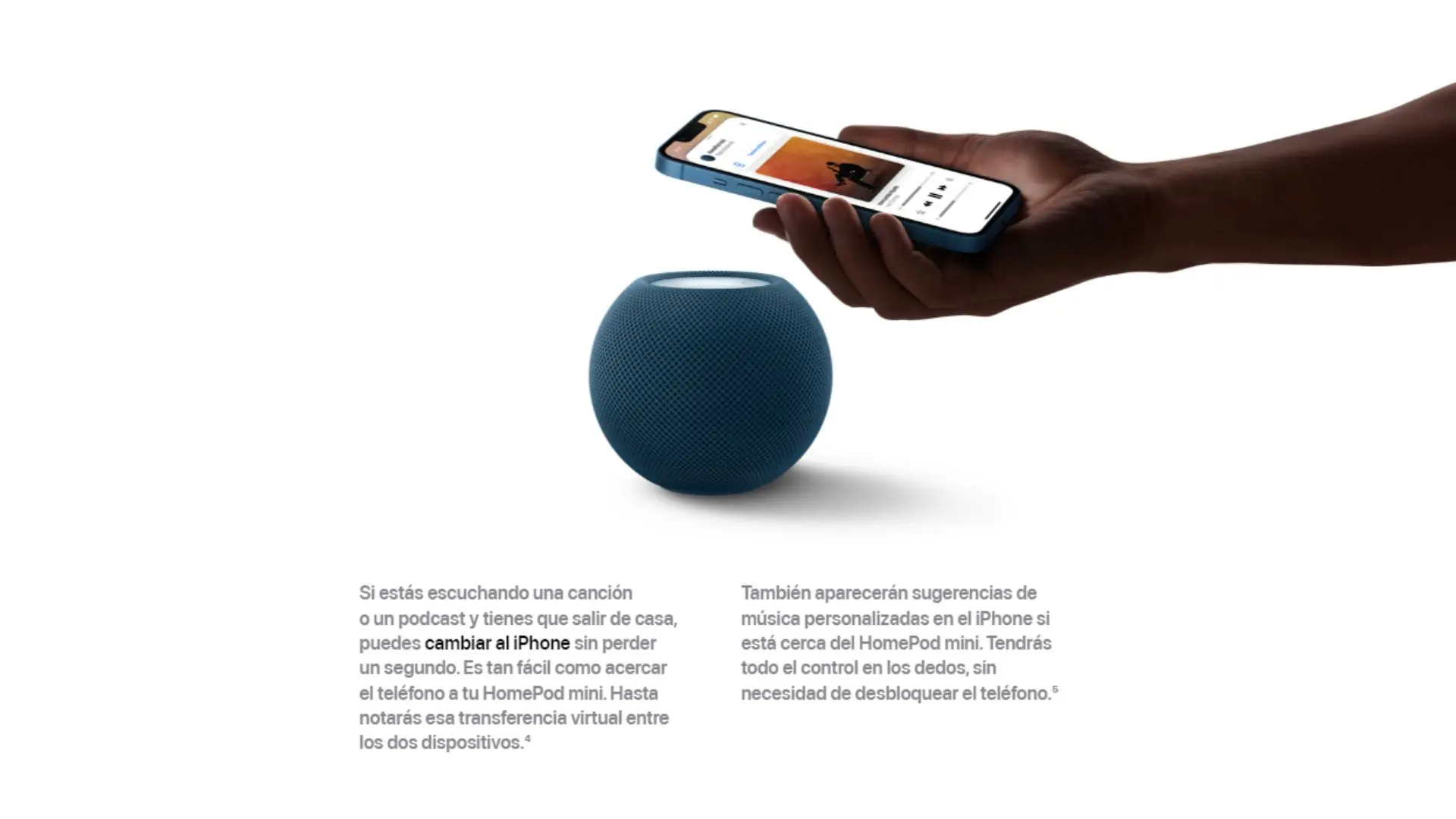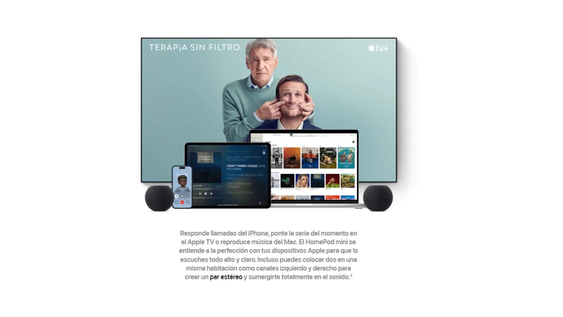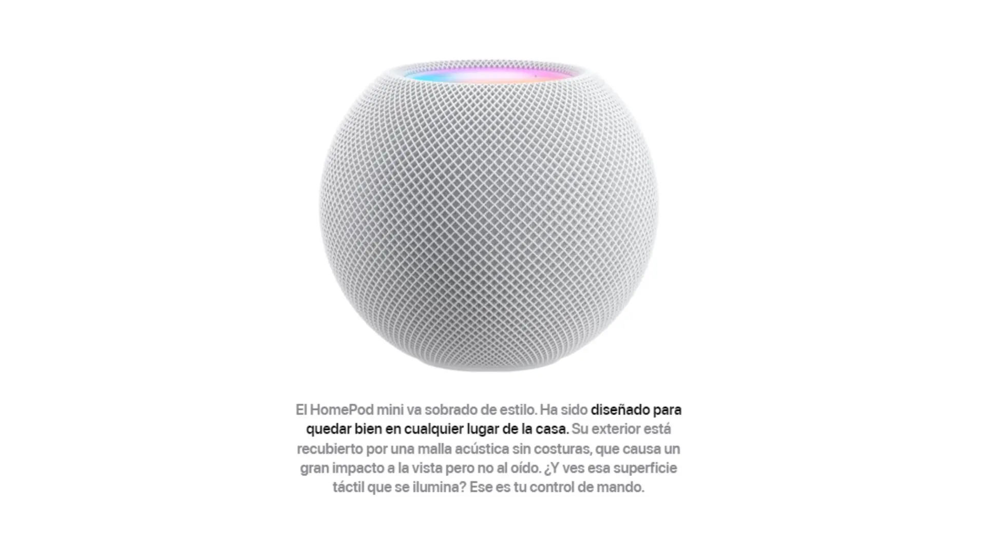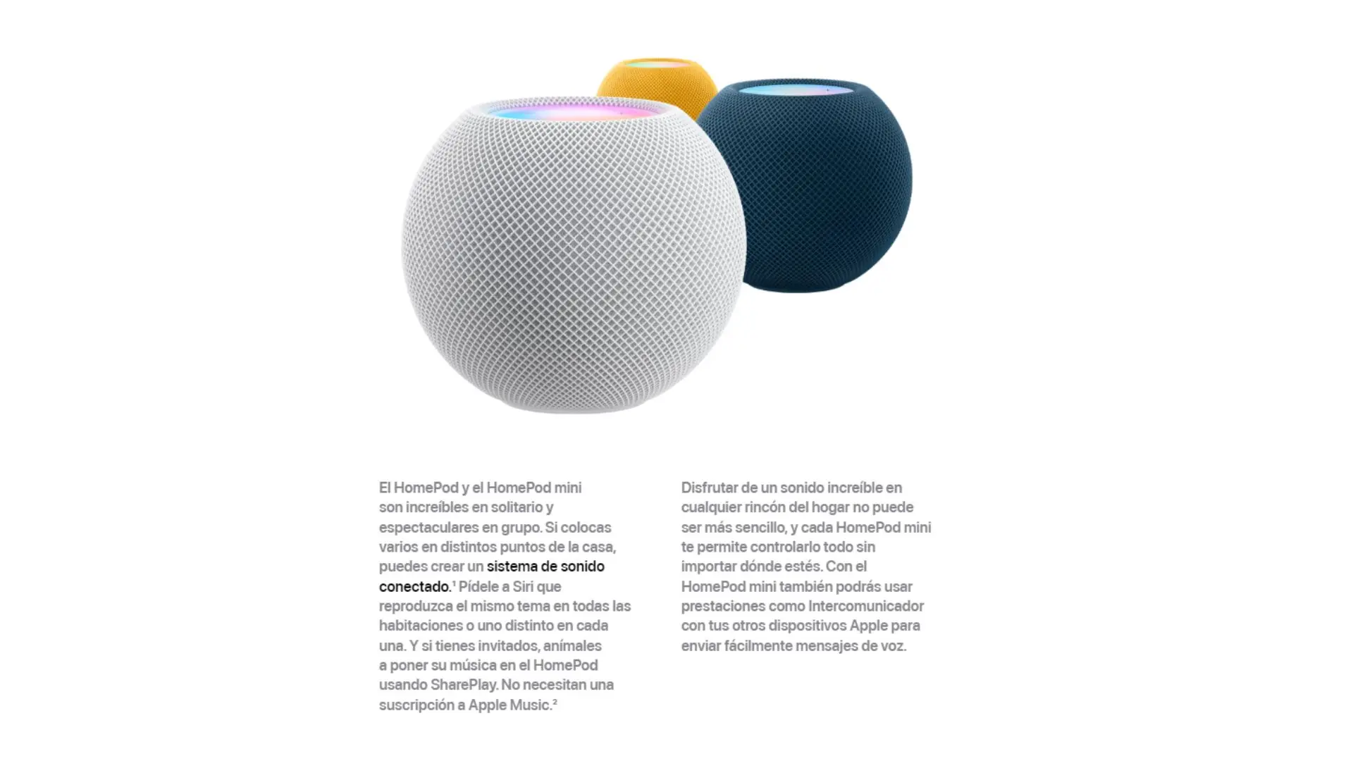 | Tecnología de sonido | Transductor de rango completo y dos radiadores pasivos para reproducir graves profundos y agudos nítidos - Guía de ondas acústicas a medida para un campo de sonido de 360 grados - Tela acústicamente transparente - Audio computacional para ajustar en tiempo real el sonido - Conjunto de cuatro micrófonos para usar Siri desde lejos - Sonido multizona con AirPlay - Compatible con par estéreo |
