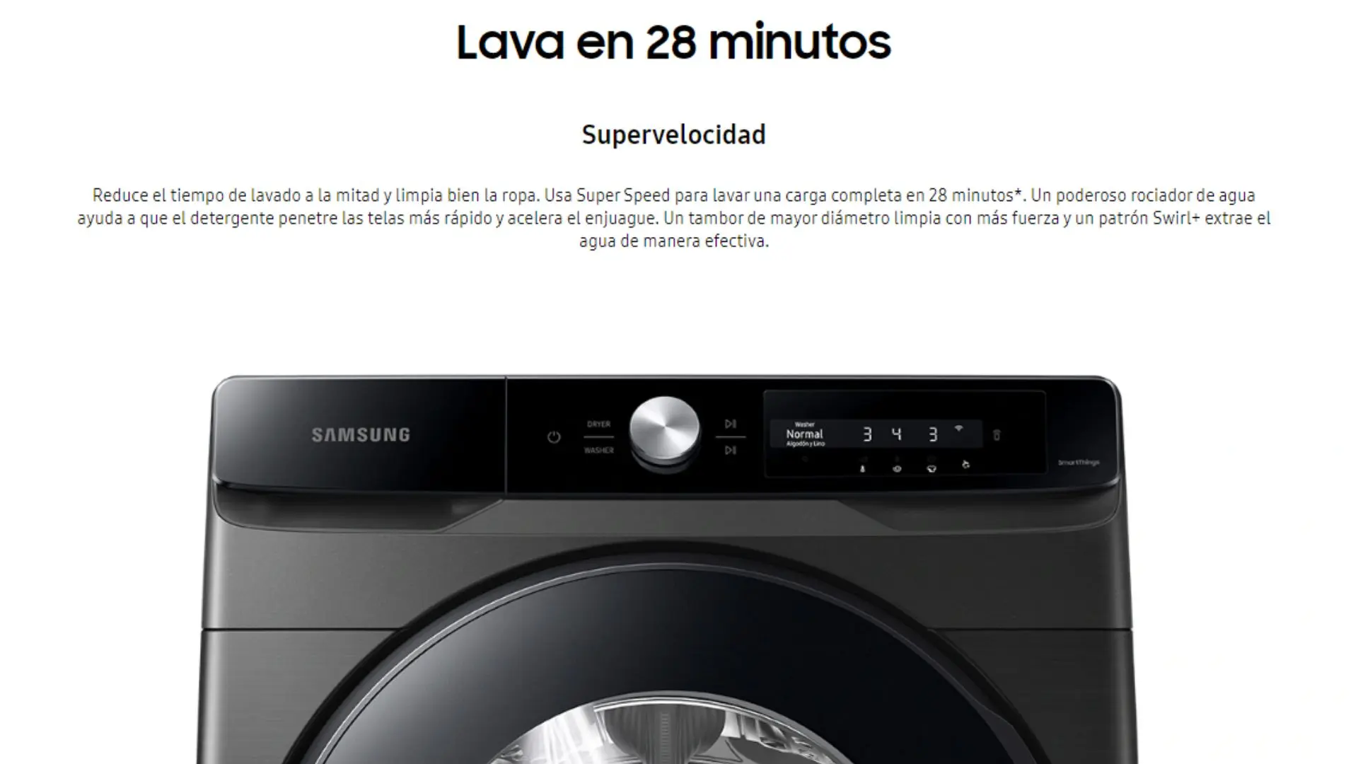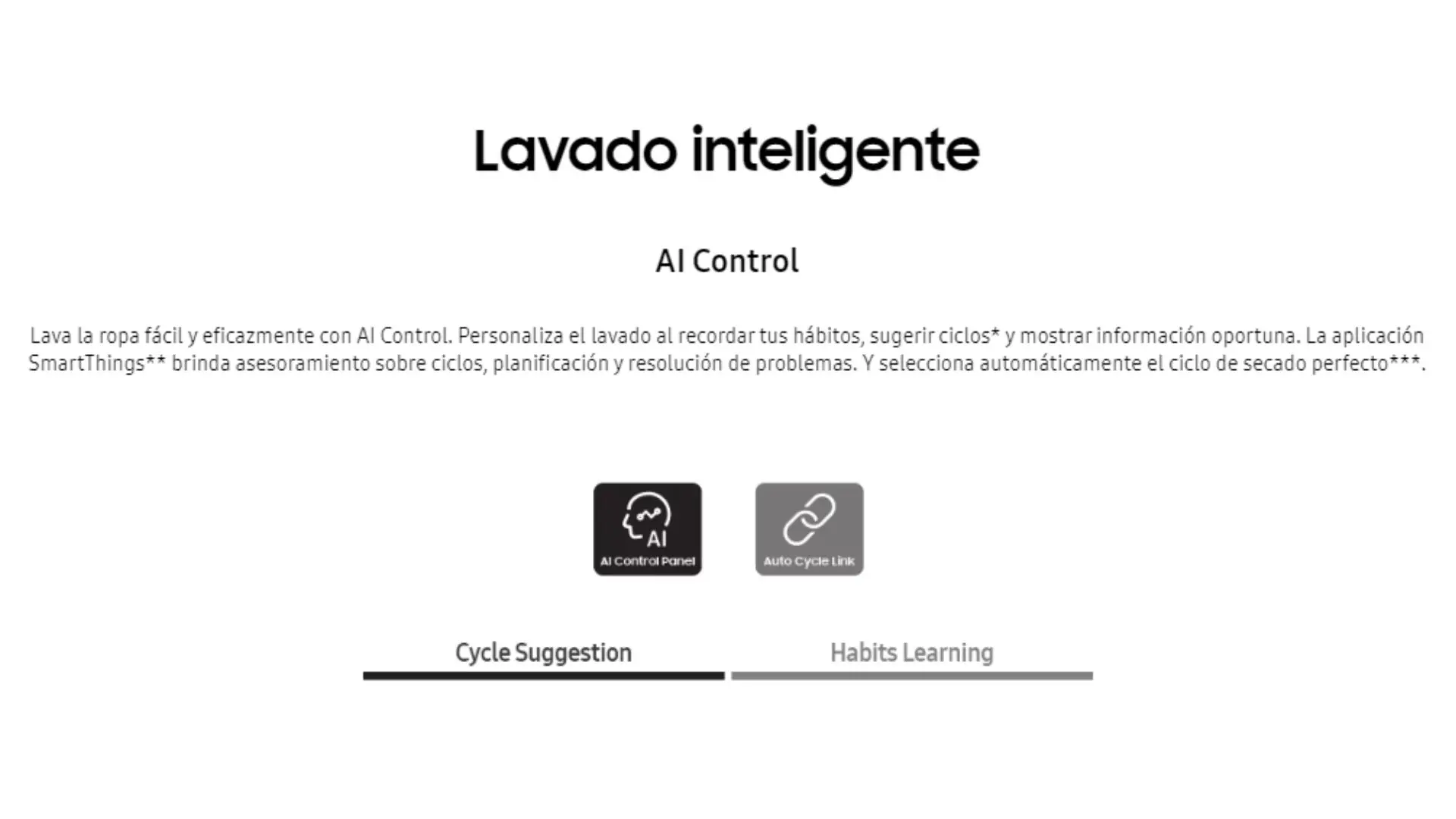 | Ciclos | Lista de ciclos: NORMAL, SuperSpeed, Heavy Duty, Small Load, Delicates, Steam Whites, Steam Sanitize, Steam Normal, Towels, Activewear, Bedding, Self Clean+, Rinse+Spin, Colors, Power Rinse, Power Steam, Perm Press, Steam Allergen, Eco Cold, Wool, Steam Bulky, Outdoor, Denim, Spin Only - Número de ciclos: 24 - Número de opciones: 13 - Lista de opciones: Pre Soak, Extra Rinse, My Cycle, Delay End, SuperSpeed, Child Lock, AI Pattern, Alarm, Calibration, WiFi, Language, Factroy Reset, Self Diagnosis |