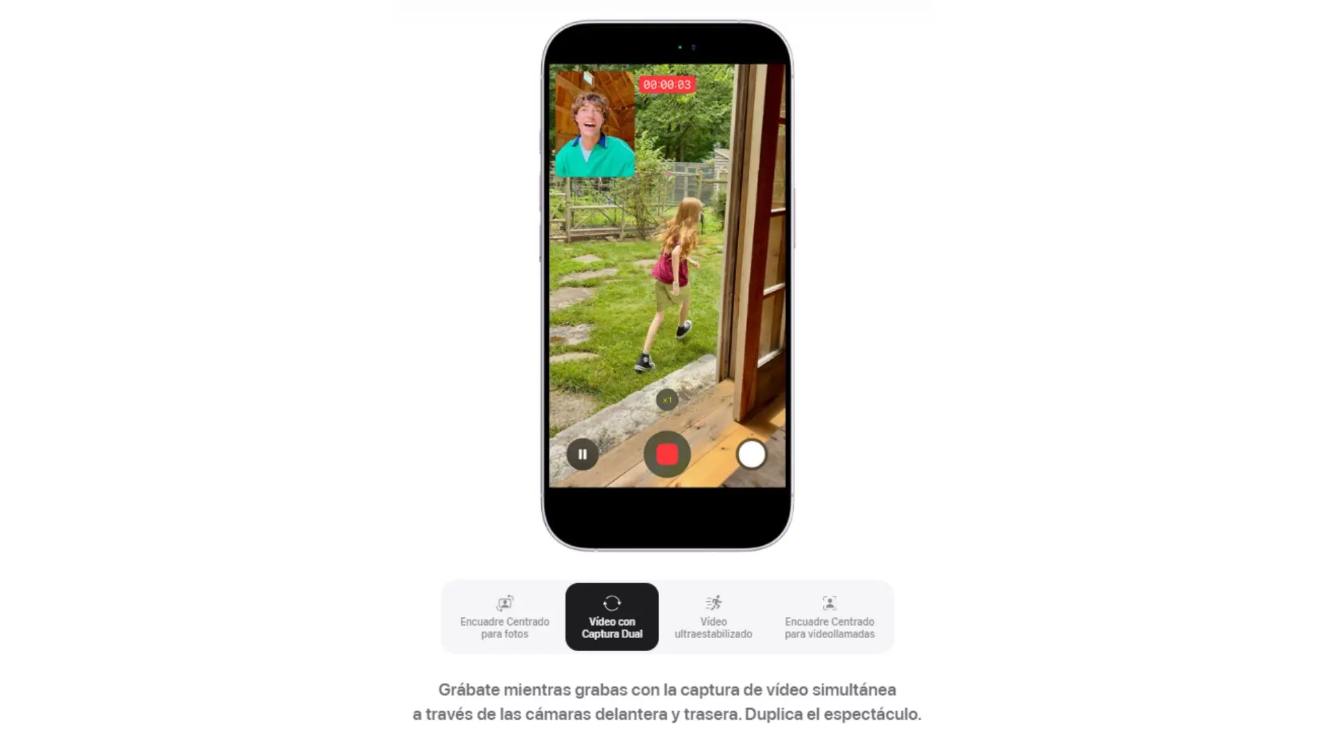 | Grabación de vídeo | Grabación de vídeo en 4K con Dolby Vision a 24, 25, 30 o 60 f/s - Grabación de vídeo en 1080p con Dolby Vision a 25, 30 o 60 f/s - Grabación de vídeo en 720p con Dolby Vision a 30 f/s - Modo Cine hasta 4K con Dolby Vision a 30 f/s - Modo Acción hasta 2,8K con Dolby Vision a 60 f/s - Grabación de vídeo macro, a cámara lenta y en time‑lapse - Vídeo a cámara lenta en 1080p a 120 o 240 f/s - Grabación de vídeo espacial en 1080p a 30 f/s - Captura Dual hasta 4K con Dolby Vision a 30 f/s - Vídeo en time‑lapse con estabilización - Time-lapse con modo Noche - Vídeo QuickTake hasta 4K con Dolby Vision a 60 f/s - Estabilización óptica de imagen por desplazamiento del sensor para vídeo (cámara principal Fusion) - Zoom digital hasta x6 - Zoom de audio - Flash True Tone - Estabilización de vídeo con calidad de cine (4K, 1080p y 720p) - Enfoque automático continuo - Opción de sacar fotos de 8 Mpx durante la grabación de vídeo en 4K - Reproducción con zoom - Grabación de vídeo en formato HEVC y H.264 - Audio espacial y grabación en estéreo - Reducción de ruido del viento - Mezcla de Audio |