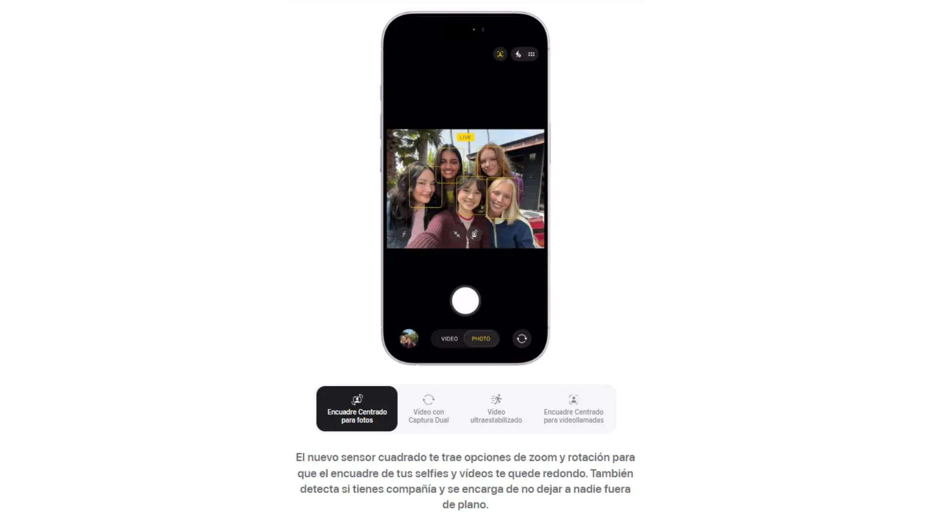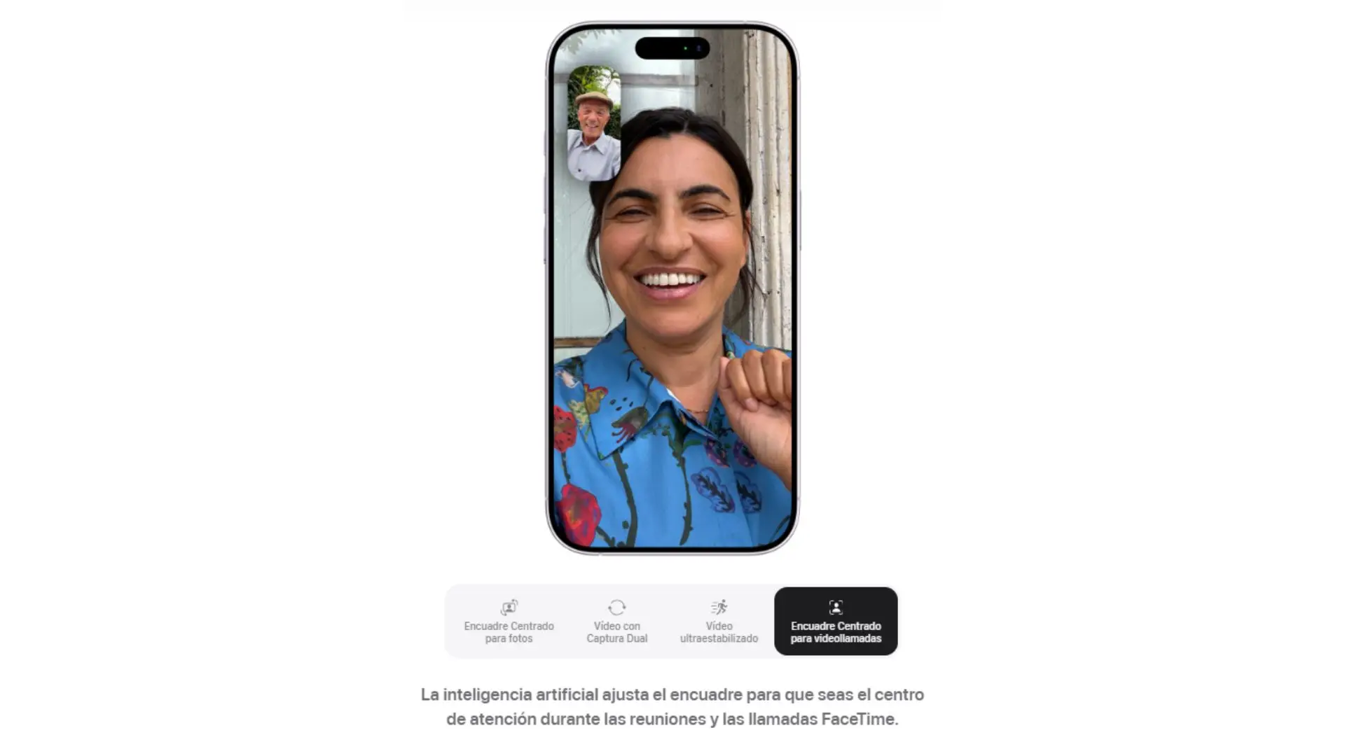 | Cámara Frontal | Cámara Center Stage de 18 Mpx - Apertura de ƒ/1,9 - Enfoque automático con Focus Pixels - Retina Flash - Tocar para hacer zoom y rotar - Encuadre Centrado para fotos - Vídeo ultraestabilizado - Captura Dual - Encuadre Centrado para videollamadas - Photonic Engine - Deep Fusion - HDR Inteligente 5 - Retratos de última generación con Control de Profundidad y Enfoque - Iluminación de Retratos con seis efectos - Animoji y Memoji - Modo Noche - Estilos Fotográficos de última generación - Gama cromática amplia para fotos y Live Photos - Corrección del objetivo - Estabilización automática de imagen - Modo de ráfaga - Grabación de vídeo en 4K con Dolby Vision a 24, 25, 30 o 60 f/s - Grabación de vídeo en 1080p con Dolby Vision a 25, 30 o 60 f/s - Modo Cine hasta 4K con Dolby Vision a 30 f/s - Vídeo a cámara lenta en 1080p a 120 f/s - Vídeo en time‑lapse con estabilización - Time-lapse con modo Noche - Vídeo QuickTake hasta 4K con Dolby Vision a 60 f/s - Estabilización de vídeo con calidad de cine (4K, 1080p y 720p) - Audio espacial y grabación en estéreo - Reducción de ruido del viento - Mezcla de Audio |