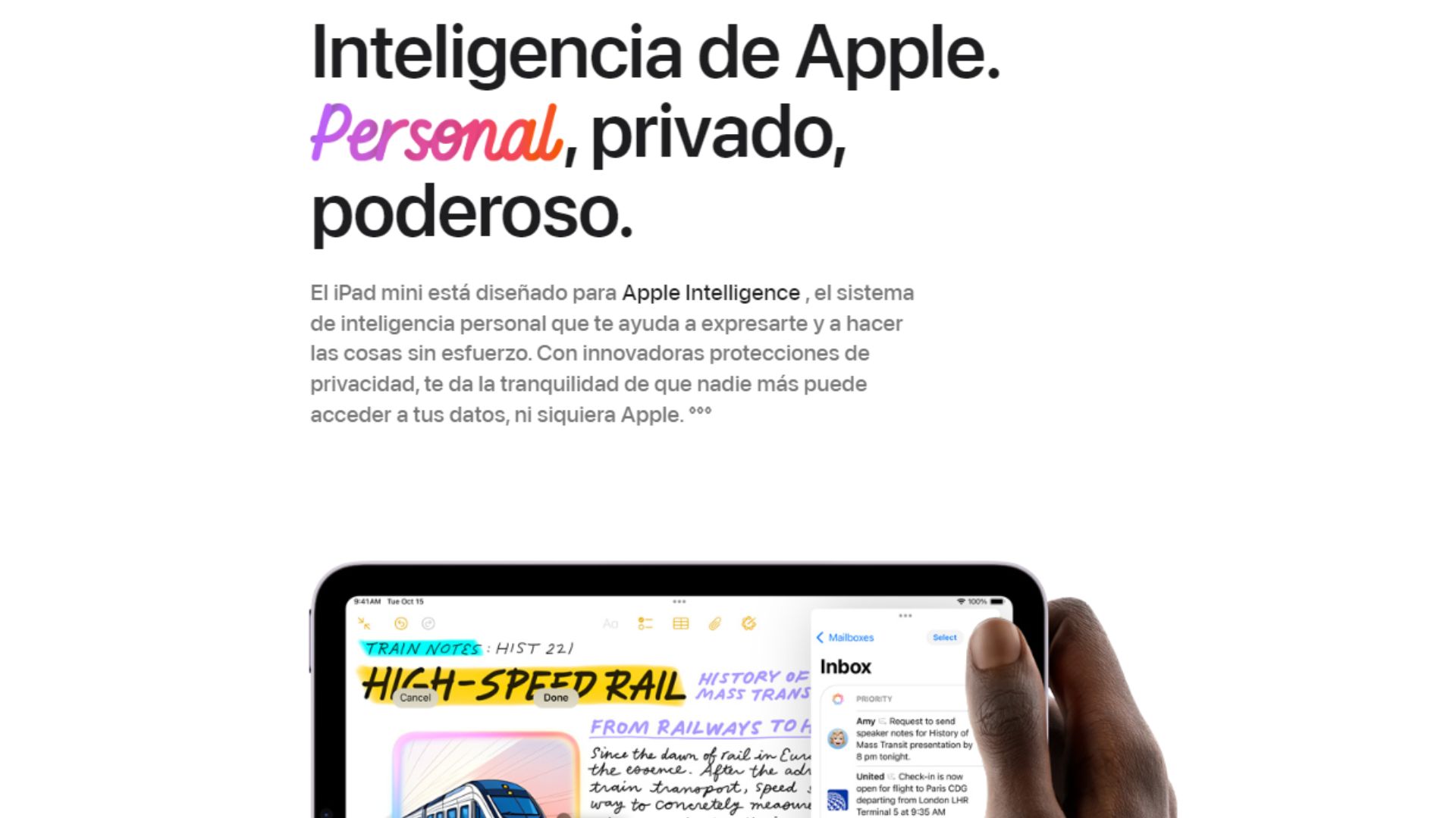 | Pantalla | Pantalla Liquid Retina | Pantalla multitáctil retroiluminada por LED con tecnología IPS | Resolución de 2266 x 1488 a 326 ppp | Amplia gama cromática (P3) | Tono verdadero | Recubrimiento oleofóbico resistente a las huellas dactilares | Totalmente laminado | Recubrimiento antirreflectante | Brillo de 500 nits | Compatible con Apple Pencil Pro | Compatible con Apple Pencil (USB-C) | Pasar el cursor sobre el Apple Pencil *La pantalla del iPad mini tiene esquinas redondeadas. Medida en diagonal como un rectángulo, la pantalla mide 8,3 pulgadas. El área visible real es menor. |