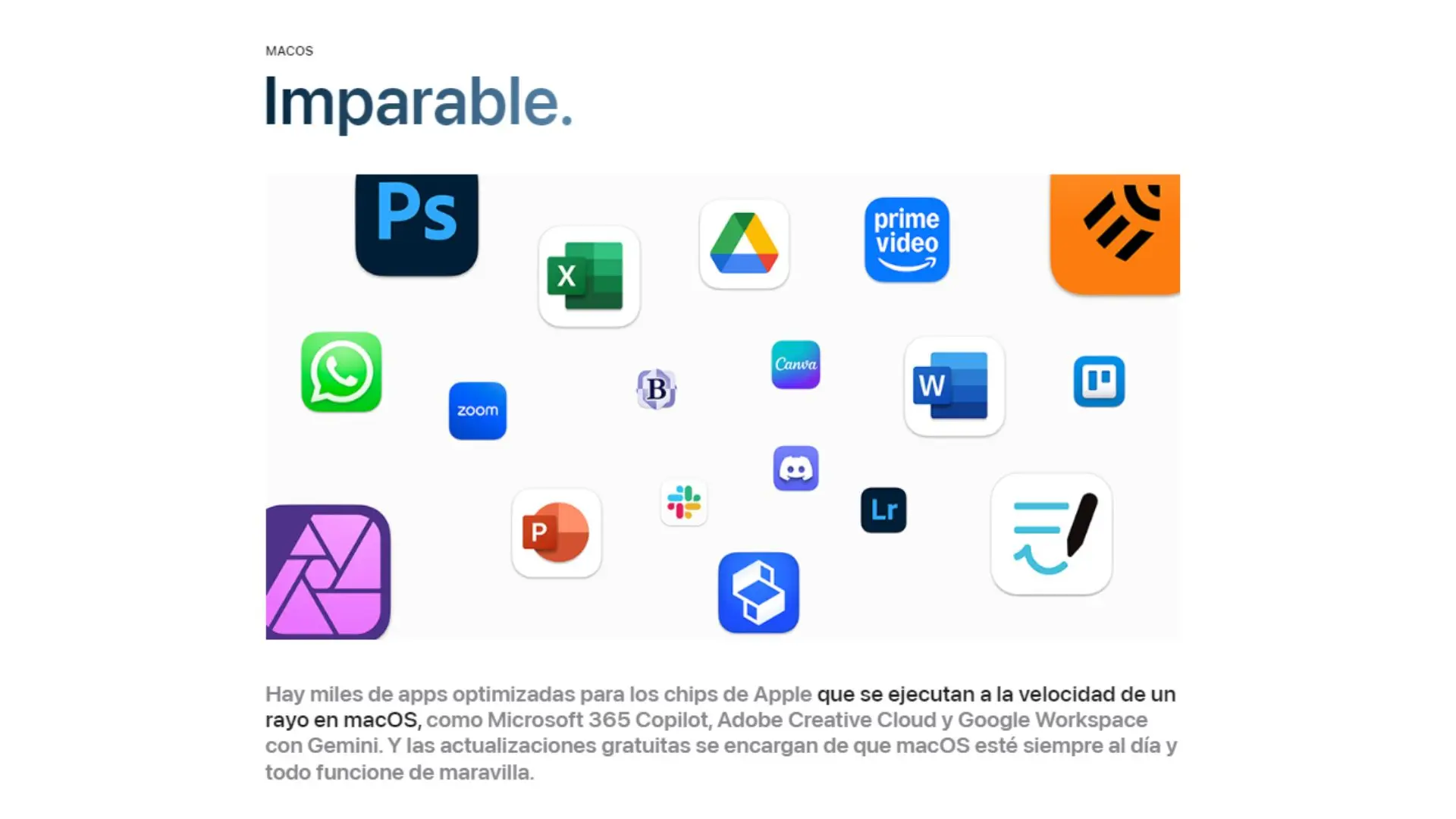 | Chip | Chip M4 de Apple | CPU de 10 núcleos con 4 núcleos de rendimiento y 6 de eficiencia | GPU de 10 núcleos | Trazado de rayos acelerado por hardware | Neural Engine de 16 núcleos | 120 GB/s de ancho de banda de memoria - Motor multimedia | H.264, HEVC, ProRes y ProRes RAW con aceleración por hardware | Motor de decodificación de video | Motor de codificación de video | Motor de codificación y decodificación ProRes | Decodificación AV1 |