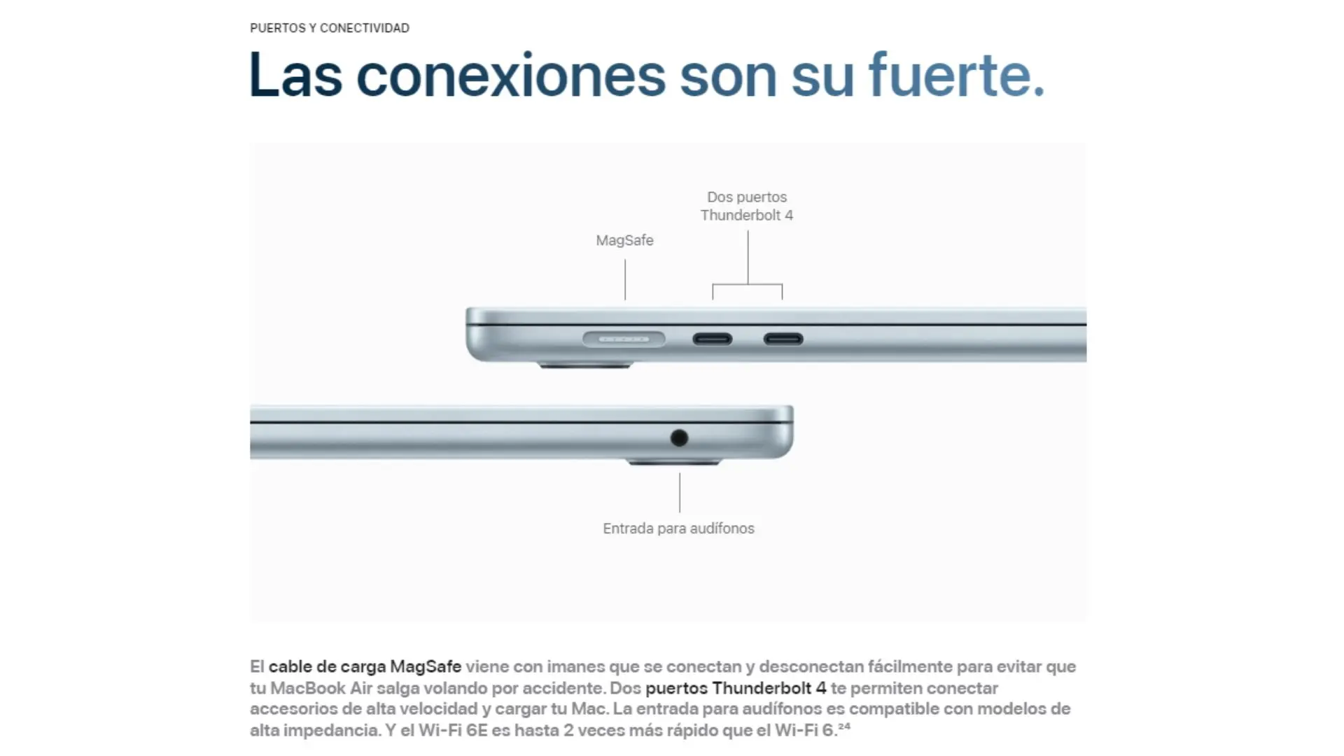 | Carga y expansión | Puerto de carga MagSafe 3 - Entrada de 3.5 mm para audífonos - Dos puertos Thunderbolt 4 (USB‑C) compatibles con: | Carga | DisplayPort | Thunderbolt 4 (hasta 40 Gb/s) | USB 4 (hasta 40 Gb/s) |