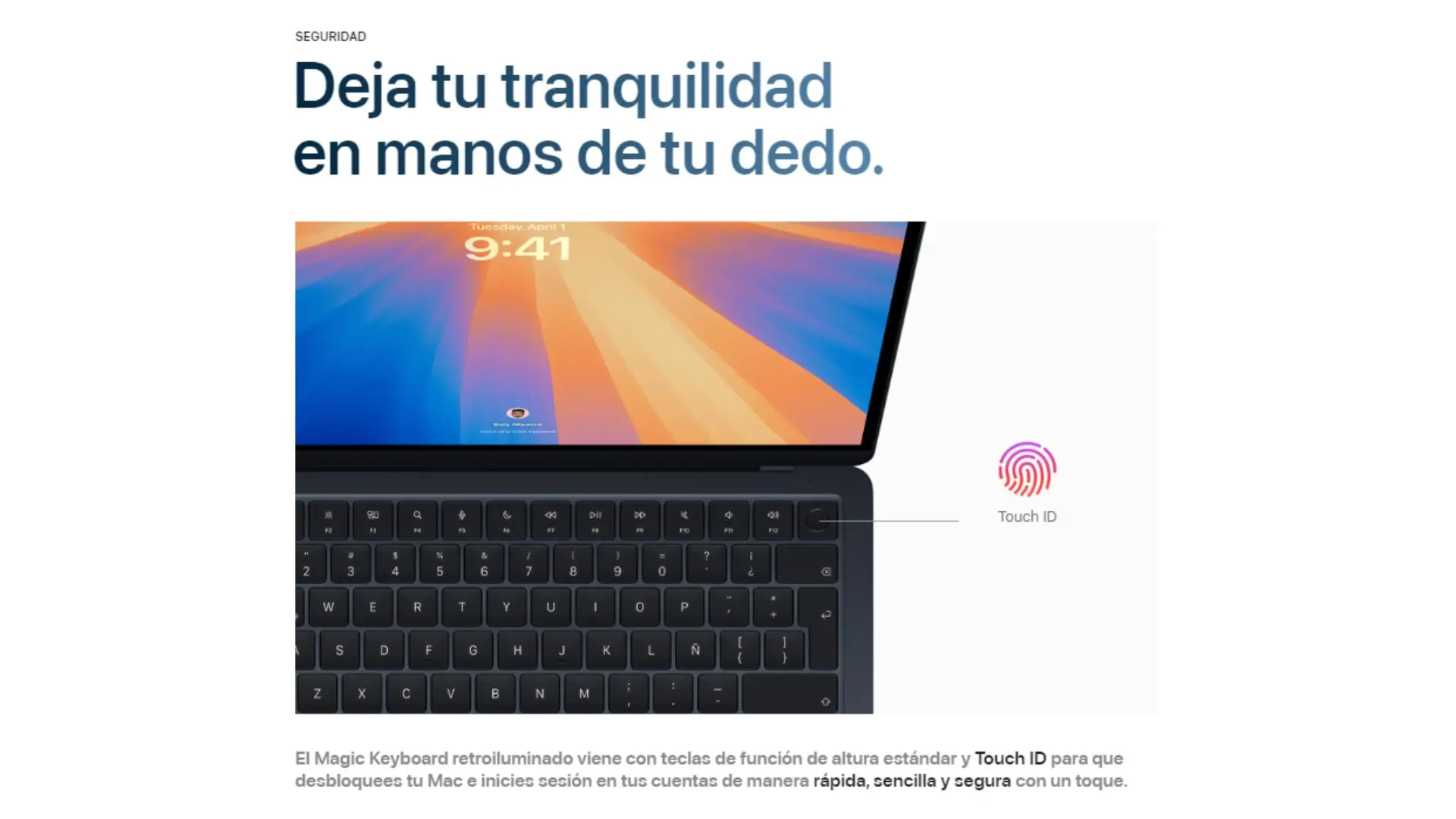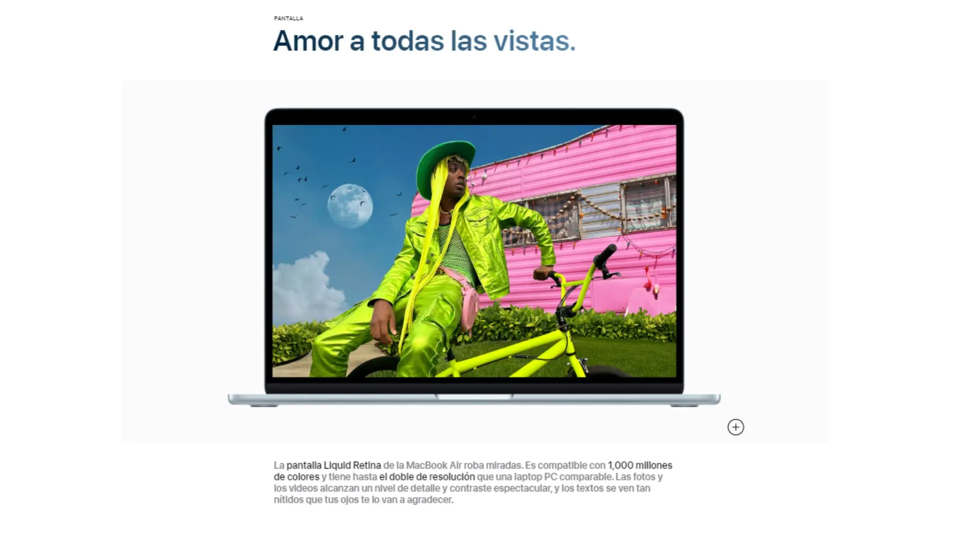 | Pantalla | Pantalla Liquid Retina | Pantalla de 13.6 pulgadas (diagonal) retroiluminada por LED con tecnología IPS; resolución nativa de 2560 x 1664 a 224 pixeles por pulgada | Brillo de 500 nits - Colores | Compatible con 1,000 millones de colores | Amplia gama de colores (P3) | Tecnología True Tone |